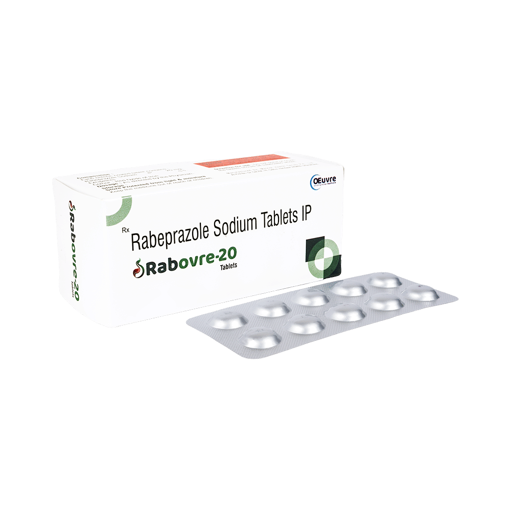 Rabovre 20 Tablet is a medicine that reduces the amount of acid produced in your stomach. It is used in the treatment of acid-related diseases of the stomach and intestine such as acid reflux, peptic ulcer disease, and Zollinger-Ellison syndrome. It provides relief from symptoms and promotes healing. Rabovre 20 Tablet medicine should be taken one hour before a meal, preferably in the morning. The dose will depend on your underlying condition and how you respond to the medicine. Try to take it regularly at the same time each day as advised by your doctor. You should keep on taking it as prescribed even if your symptoms disappear quickly. You may be able to help improve your symptoms by eating smaller meals more often and avoiding caffeinated drinks like tea and coffee, and spicy or fatty foods.This medicine's most common side effects include nausea, vomiting, headache, dizziness, flatulence, diarrhea, and stomach pain. These tend to be mild but talk to your doctor if they bother you or do not go away. The risk of side effects may increase the longer you take this medicine. Long-term use (more than 1 year) may increase your risk for bone fractures, especially with higher doses. Talk to your doctor about ways to prevent bone loss (osteoporosis), like taking calcium and vitamin D supplements.Low blood magnesium levels (hypomagnesemia) have been seen in some people taking this medicine for 3 months or more. This may lead to tiredness, confusion, dizziness, muscle twitches, and an irregular heartbeat. Your doctor may monitor your magnesium levels to prevent this.Rabovre 20 Tablet is not suitable for some people. Before taking this medicine, you need to tell your doctor if you have severe liver problems, are taking medicines for HIV, have ever had an allergic reaction to similar medicines in the past, or suffer from bone loss (osteoporosis). Pregnant or breastfeeding women should also consult their doctor before taking it. Avoid drinking alcohol as it makes your stomach produce excessive acid and can worsen your symptoms. Do not drive or use machinery or tools, if this medicine makes you feel dizzy or sleepy.