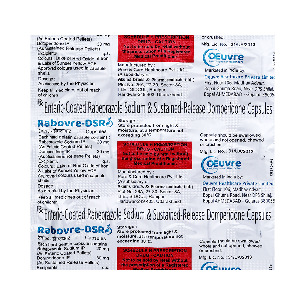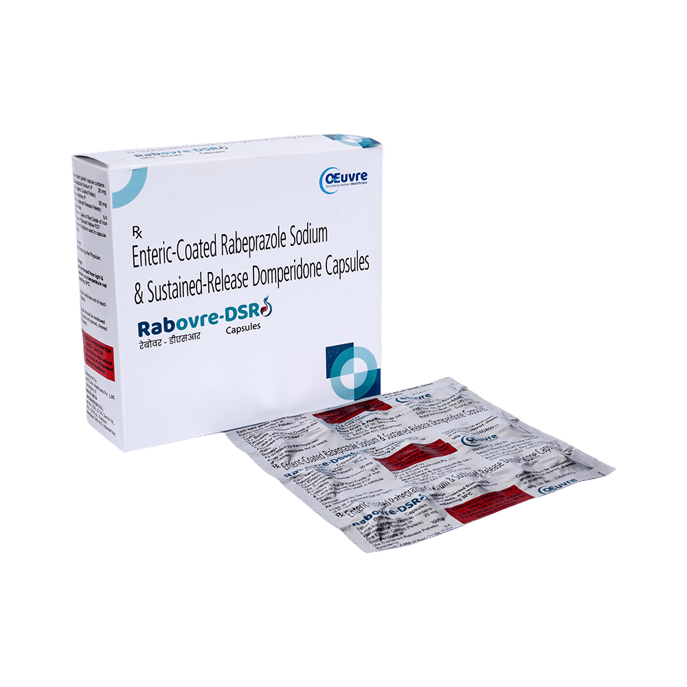 Rabovre-DSR Capsule is a combination of two medicines: Domperidone and Rabeprazole. Domperidone is a prokinetic that works on the upper digestive tract to increase the movement of the stomach and intestines, allowing the food to move more easily through the stomach. Rabeprazole is a proton pump inhibitor (PPI) which works by reducing the amount of acid in the stomach, which helps in the relief of acid-related indigestion and heartburn.