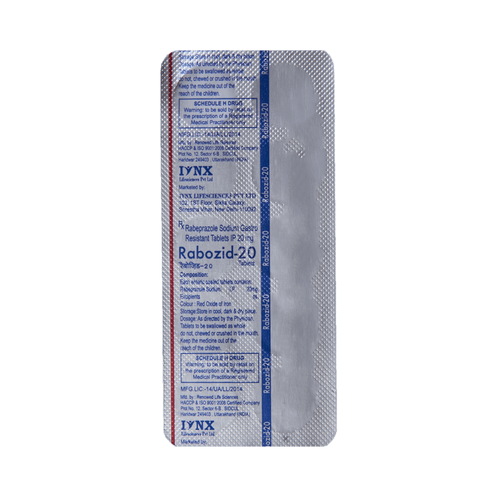 Rabozid 20 Tablet is a medicine that reduces the amount of acid produced in your stomach. It is used in the treatment of acid-related diseases of the stomach and intestine such as acid reflux, peptic ulcer disease, and Zollinger-Ellison syndrome. It provides relief from symptoms and promotes healing. Rabozid 20 Tablet medicine should be taken one hour before a meal, preferably in the morning. The dose will depend on your underlying condition and how you respond to the medicine. Try to take it regularly at the same time each day as advised by your doctor. You should keep on taking it as prescribed even if your symptoms disappear quickly. You may be able to help improve your symptoms by eating smaller meals more often and avoiding caffeinated drinks like tea and coffee, and spicy or fatty foods.This medicine's most common side effects include nausea, vomiting, headache, dizziness, flatulence, diarrhea, and stomach pain. These tend to be mild but talk to your doctor if they bother you or do not go away. The risk of side effects may increase the longer you take this medicine. Long-term use (more than 1 year) may increase your risk for bone fractures, especially with higher doses. Talk to your doctor about ways to prevent bone loss (osteoporosis), like taking calcium and vitamin D supplements.Low blood magnesium levels (hypomagnesemia) have been seen in some people taking this medicine for 3 months or more. This may lead to tiredness, confusion, dizziness, muscle twitches, and an irregular heartbeat. Your doctor may monitor your magnesium levels to prevent this.Rabozid 20 Tablet is not suitable for some people. Before taking this medicine, you need to tell your doctor if you have severe liver problems, are taking medicines for HIV, have ever had an allergic reaction to similar medicines in the past, or suffer from bone loss (osteoporosis). Pregnant or breastfeeding women should also consult their doctor before taking it. Avoid drinking alcohol as it makes your stomach produce excessive acid and can worsen your symptoms. Do not drive or use machinery or tools, if this medicine makes you feel dizzy or sleepy.