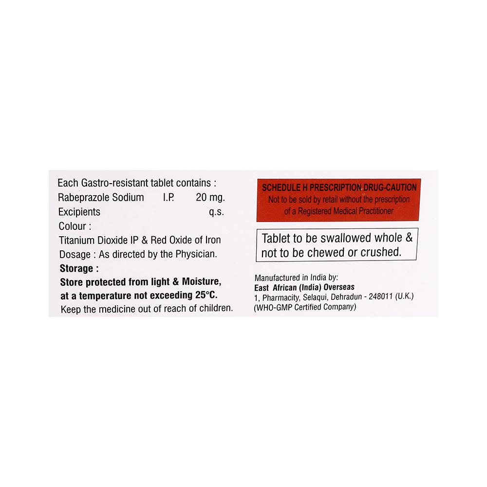 Rabron 20 Tablet is a medicine that reduces the amount of acid produced in your stomach. It is used in the treatment of acid-related diseases of the stomach and intestine such as acid reflux, peptic ulcer disease, and Zollinger-Ellison syndrome. It provides relief from symptoms and promotes healing. Rabron 20 Tablet medicine should be taken one hour before a meal, preferably in the morning. The dose will depend on your underlying condition and how you respond to the medicine. Try to take it regularly at the same time each day as advised by your doctor. You should keep on taking it as prescribed even if your symptoms disappear quickly. You may be able to help improve your symptoms by eating smaller meals more often and avoiding caffeinated drinks like tea and coffee, and spicy or fatty foods.This medicine's most common side effects include nausea, vomiting, headache, dizziness, flatulence, diarrhea, and stomach pain. These tend to be mild but talk to your doctor if they bother you or do not go away. The risk of side effects may increase the longer you take this medicine. Long-term use (more than 1 year) may increase your risk for bone fractures, especially with higher doses. Talk to your doctor about ways to prevent bone loss (osteoporosis), like taking calcium and vitamin D supplements.Low blood magnesium levels (hypomagnesemia) have been seen in some people taking this medicine for 3 months or more. This may lead to tiredness, confusion, dizziness, muscle twitches, and an irregular heartbeat. Your doctor may monitor your magnesium levels to prevent this.Rabron 20 Tablet is not suitable for some people. Before taking this medicine, you need to tell your doctor if you have severe liver problems, are taking medicines for HIV, have ever had an allergic reaction to similar medicines in the past, or suffer from bone loss (osteoporosis). Pregnant or breastfeeding women should also consult their doctor before taking it. Avoid drinking alcohol as it makes your stomach produce excessive acid and can worsen your symptoms. Do not drive or use machinery or tools, if this medicine makes you feel dizzy or sleepy.
