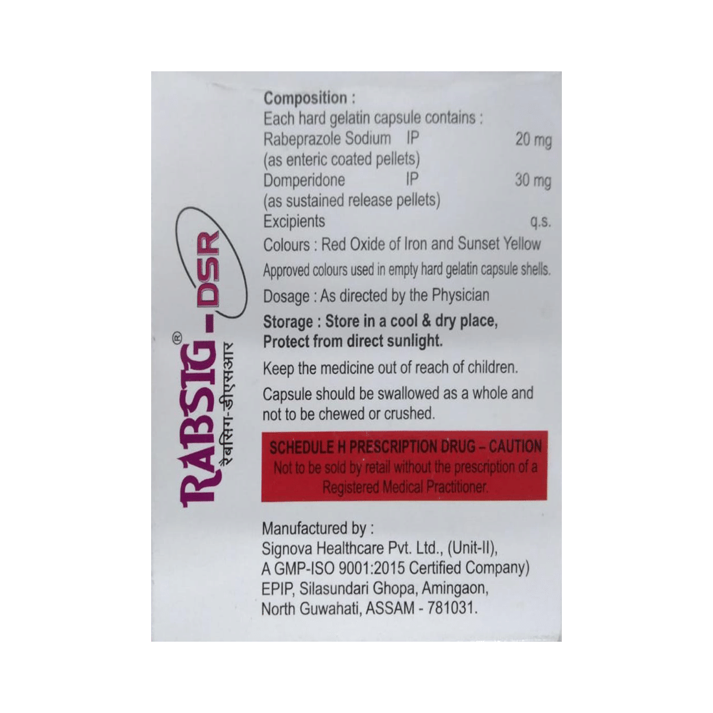 Rabsig-DSR Capsule is a combination medicine used to treat gastroesophageal reflux disease (acid reflux). It works by relieving the symptoms of acidity such as heartburn, stomach pain, or irritation. It also neutralizes the acid and promotes easy passage of gas to reduce stomach discomfort. Rabsig-DSR Capsule is taken without food in a dose and duration as advised by the doctor. The dose you are given will depend on your condition and how you respond to the medicine. You should keep taking this medicine for as long as your doctor recommends. If you stop treatment too early your symptoms may come back and your condition may worsen. Let your healthcare team know about all other medications you are taking as some may affect, or be affected by this medicine.The most common side effects are diarrhea, stomach pain, dryness in the mouth, headache, flatulence, and weakness. Most of these are temporary and usually resolve with time. Contact your doctor straight away if you are at all concerned about any of these side effects. This medicine may cause dizziness and sleepiness, so do not drive or do anything that requires mental focus until you know how this medicine affects you. Avoid drinking alcohol while taking this medicine as it can worsen your sleepiness. Lifestyle modifications like having cold milk and avoiding hot tea, coffee, spicy food or chocolate can help you to get better results.Before you start taking this medicine it is important to inform your doctor if you are suffering from kidney or liver disease. You should also tell your doctor if you are pregnant, planning pregnancy or breastfeeding.