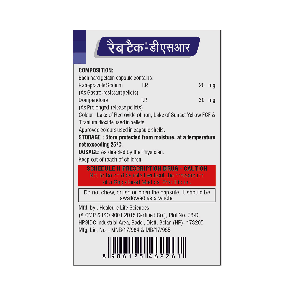 Rabtech-DSR Capsule is a combination medicine used to treat gastroesophageal reflux disease (acid reflux). It works by relieving the symptoms of acidity such as heartburn, stomach pain, or irritation. It also neutralizes the acid and promotes easy passage of gas to reduce stomach discomfort. Rabtech-DSR Capsule is taken without food in a dose and duration as advised by the doctor. The dose you are given will depend on your condition and how you respond to the medicine. You should keep taking this medicine for as long as your doctor recommends. If you stop treatment too early your symptoms may come back and your condition may worsen. Let your healthcare team know about all other medications you are taking as some may affect, or be affected by this medicine.The most common side effects are diarrhea, stomach pain, dryness in the mouth, headache, flatulence, and weakness. Most of these are temporary and usually resolve with time. Contact your doctor straight away if you are at all concerned about any of these side effects. This medicine may cause dizziness and sleepiness, so do not drive or do anything that requires mental focus until you know how this medicine affects you. Avoid drinking alcohol while taking this medicine as it can worsen your sleepiness. Lifestyle modifications like having cold milk and avoiding hot tea, coffee, spicy food or chocolate can help you to get better results.Before you start taking this medicine it is important to inform your doctor if you are suffering from kidney or liver disease. You should also tell your doctor if you are pregnant, planning pregnancy or breastfeeding.