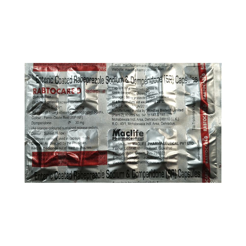 Rabtocare-D Capsule SR is a combination medicine used to treat gastroesophageal reflux disease (acid reflux). It works by relieving the symptoms of acidity such as heartburn, stomach pain, or irritation. It also neutralizes the acid and promotes easy passage of gas to reduce stomach discomfort. Rabtocare-D Capsule SR is taken without food in a dose and duration as advised by the doctor. The dose you are given will depend on your condition and how you respond to the medicine. You should keep taking this medicine for as long as your doctor recommends. If you stop treatment too early your symptoms may come back and your condition may worsen. Let your healthcare team know about all other medications you are taking as some may affect, or be affected by this medicine.The most common side effects are diarrhea, stomach pain, dryness in the mouth, headache, flatulence, and weakness. Most of these are temporary and usually resolve with time. Contact your doctor straight away if you are at all concerned about any of these side effects. This medicine may cause dizziness and sleepiness, so do not drive or do anything that requires mental focus until you know how this medicine affects you. Avoid drinking alcohol while taking this medicine as it can worsen your sleepiness. Lifestyle modifications like having cold milk and avoiding hot tea, coffee, spicy food or chocolate can help you to get better results.Before you start taking this medicine it is important to inform your doctor if you are suffering from kidney or liver disease. You should also tell your doctor if you are pregnant, planning pregnancy or breastfeeding.