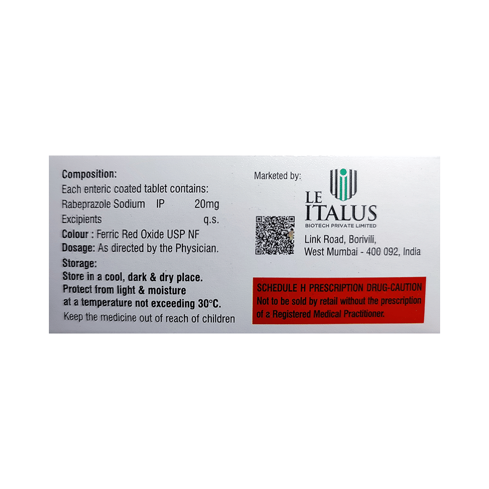 Rabtrion 20 Tablet is a medicine that reduces the amount of acid produced in your stomach. It is used in the treatment of acid-related diseases of the stomach and intestine such as acid reflux, peptic ulcer disease, and Zollinger-Ellison syndrome. It provides relief from symptoms and promotes healing. Rabtrion 20 Tablet medicine should be taken one hour before a meal, preferably in the morning. The dose will depend on your underlying condition and how you respond to the medicine. Try to take it regularly at the same time each day as advised by your doctor. You should keep on taking it as prescribed even if your symptoms disappear quickly. You may be able to help improve your symptoms by eating smaller meals more often and avoiding caffeinated drinks like tea and coffee, and spicy or fatty foods.This medicine's most common side effects include nausea, vomiting, headache, dizziness, flatulence, diarrhea, and stomach pain. These tend to be mild but talk to your doctor if they bother you or do not go away. The risk of side effects may increase the longer you take this medicine. Long-term use (more than 1 year) may increase your risk for bone fractures, especially with higher doses. Talk to your doctor about ways to prevent bone loss (osteoporosis), like taking calcium and vitamin D supplements.Low blood magnesium levels (hypomagnesemia) have been seen in some people taking this medicine for 3 months or more. This may lead to tiredness, confusion, dizziness, muscle twitches, and an irregular heartbeat. Your doctor may monitor your magnesium levels to prevent this.Rabtrion 20 Tablet is not suitable for some people. Before taking this medicine, you need to tell your doctor if you have severe liver problems, are taking medicines for HIV, have ever had an allergic reaction to similar medicines in the past, or suffer from bone loss (osteoporosis). Pregnant or breastfeeding women should also consult their doctor before taking it. Avoid drinking alcohol as it makes your stomach produce excessive acid and can worsen your symptoms. Do not drive or use machinery or tools, if this medicine makes you feel dizzy or sleepy.