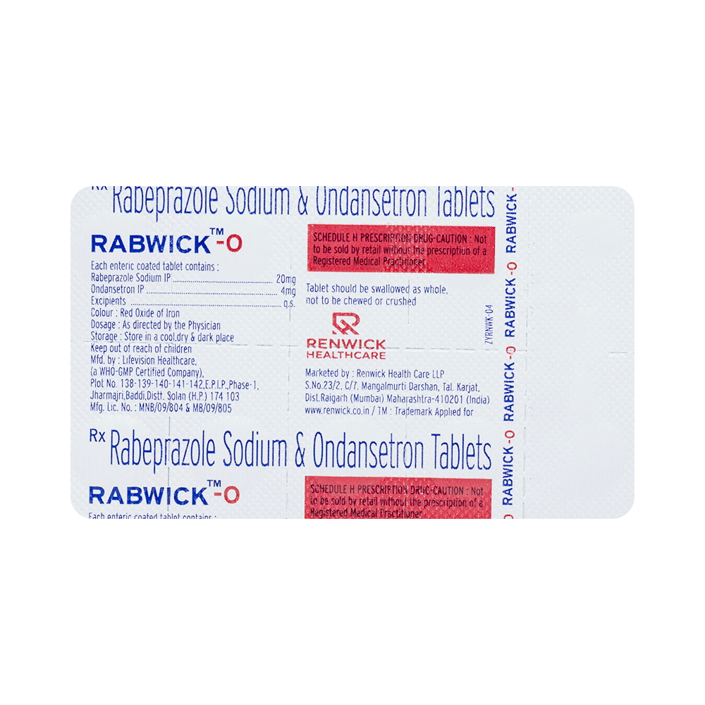 Rabwick-O Tablet is a combination of two medicines: Ondansetron and Rabeprazole. Ondansetron is an antiemetic medication. It works by blocking the action of a chemical messenger (serotonin) in the brain that may cause nausea and vomiting. Rabeprazole is a proton pump inhibitor (PPI) which works by reducing the amount of acid in the stomach which helps in the relief of acid-related indigestion and heartburn.