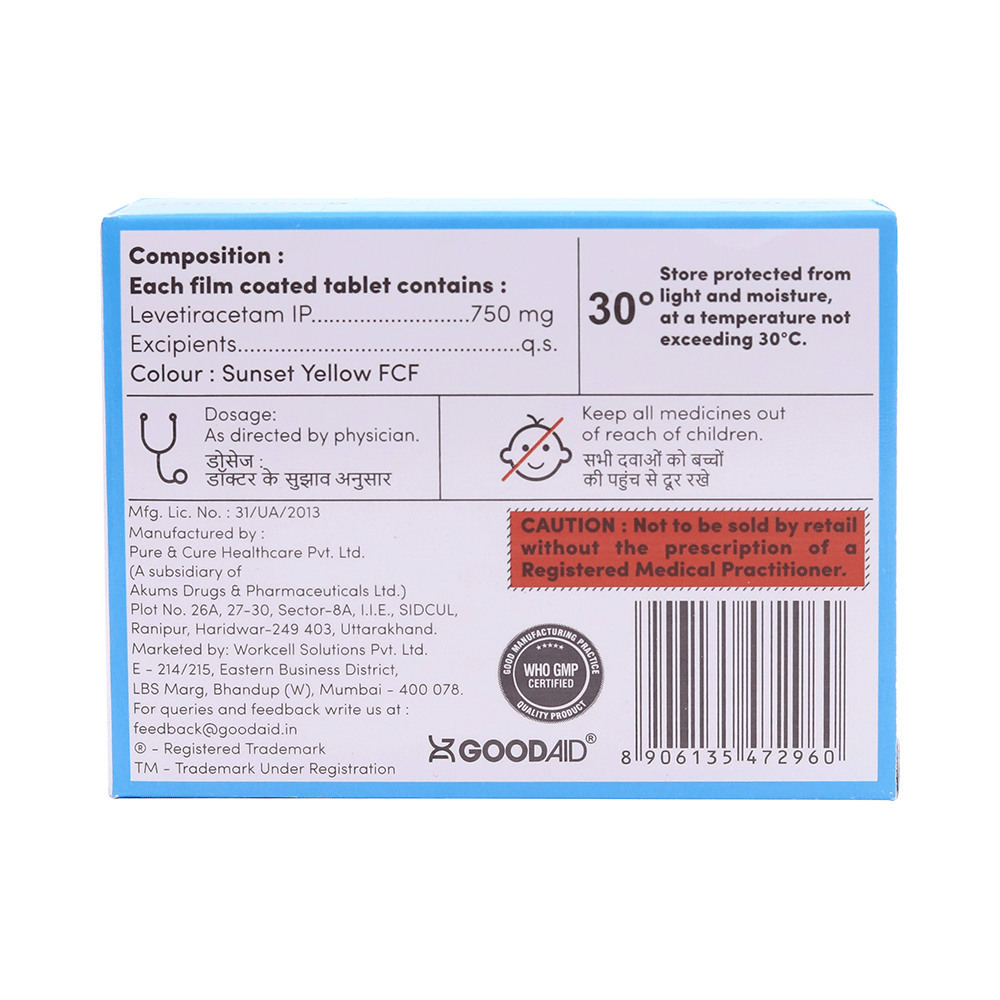 In Treatment of Epilepsy/SeizuresRacetamaid 750 Tablet belongs to a group of medicines called anticonvulsants (or anti-epileptics). It works by slowing down electrical signals in the brain which cause seizures (fits). This medicine can be used to control various types of seizures—myoclonic, partial-onset, and primary generalized tonic-clonic (or grand mal). It can also help reduce symptoms such as confusion, uncontrollable jerking movements, loss of awareness, and fear or anxiety. The medicine can allow you to do some activities that you would otherwise be forbidden or scared to do (such as swimming and driving). It can take a few weeks for this medicine to work (because the dose has to be increased slowly) and during this time you may still have seizures. You should continue taking it even if you feel well and are not having any seizures. Missing doses may trigger a seizure. Do not stop using this medicine until your doctor advises you.