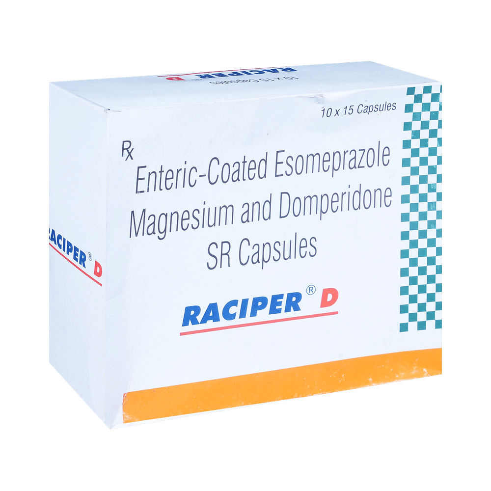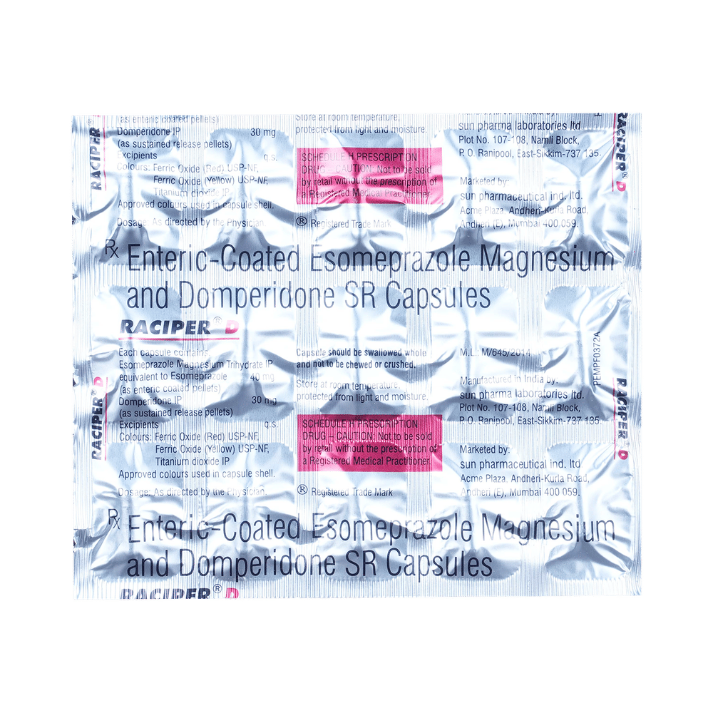 Raciper D 40 Capsule SR is a prescription medicine used to treat gastroesophageal reflux disease (acid reflux). It helps relieve symptoms such as heartburn, stomach pain, or irritation. It also neutralizes the acid in the stomach and promotes easy gas passage to reduce stomach discomfort. Raciper D 40 Capsule SR is best taken on an empty stomach. Take it in the dose and duration advised by the doctor. Continue taking this medicine for as long as your doctor recommends. If you stop treatment too early, your symptoms may come back, and your condition may worsen. Let your doctor know about all other medications you are taking, as some may affect, or be affected by, this medicine.The most common side effects of Raciper D 40 Capsule SR include diarrhea, flatulence, stomach pain, dryness in the mouth, and headache. Most of these are temporary and usually resolve with time. Contact your doctor straight away if you are at all concerned about any side effects. It may also cause sleepiness and dizziness, so do not drive or do anything that requires mental focus until you know how this medicine affects you.Before taking this medicine, you should tell your doctor if you are pregnant, planning pregnancy, or breastfeeding. You should also tell your doctor if you have severe liver disease so that your doctor can prescribe a suitable dose for you. Lifestyle modifications like having cold milk and avoiding hot tea, coffee, spicy food, or chocolate can help you get better results.