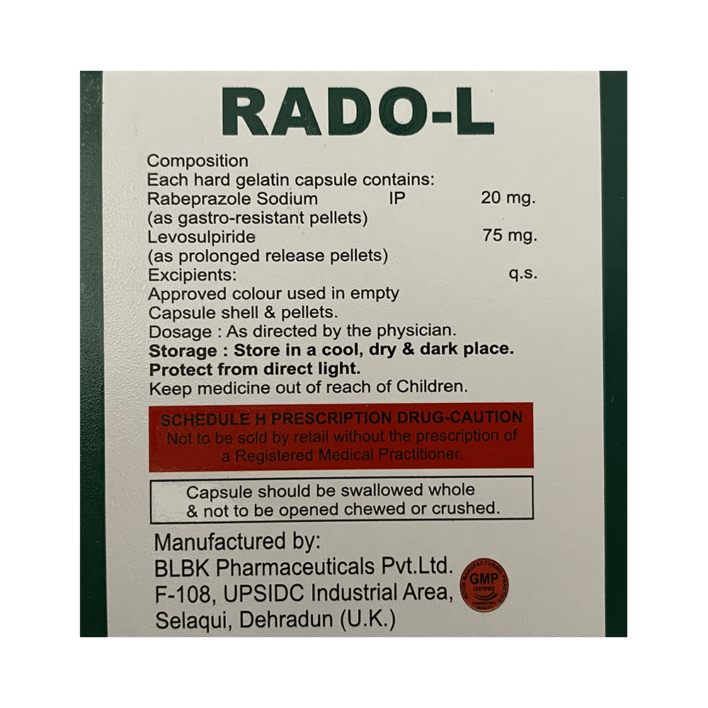 Rado-L Capsule PR is a prescription medicine which is used in the treatment of gastroesophageal reflux disease (acid reflux), intestinal ulcers, and irritable bowel syndrome. It reduces excess acid production in the stomach and prevents the reflux of stomach acid into the food pipe. Rado-L Capsule PR is taken with or without food in a dose and duration as advised by the doctor. The dose you are given will depend on your condition and how you respond to the medicine. You should keep taking this medicine for as long as your doctor recommends. If you stop treatment too early your symptoms may come back and your condition may worsen. Let your healthcare team know about all other medications you are taking as some may affect, or be affected by this medicine.The most common side effects are nausea, stomach pain, diarrhea, flatulence, constipation, headache, weakness, and flu-like symptoms. Most of these are temporary and usually resolve with time. Contact your doctor straight away if you are at all concerned about any of these side effects. It may also cause dizziness and sleepiness, so do not drive or do anything that requires mental focus until you know how this medicine affects you. Avoid drinking alcohol while taking this medicine as it can worsen your sleepiness.Lifestyle modifications like having fiber-rich diet, avoiding foods that trigger your symptoms, increasing fluid intake and regular exercise can help you to get better results. Before taking it, you should tell your doctor if you have any kidney or liver diseases. You should also tell your doctor if you are pregnant, planning pregnancy or breastfeeding.