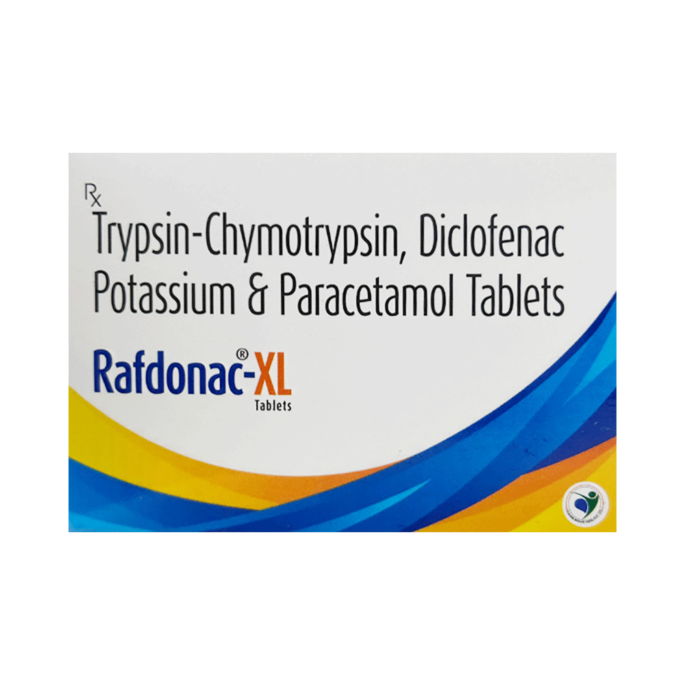 Rafdonac-XL Tablet is a combination of three medicines: Diclofenac, Paracetamol and Trypsin Chymotrypsin which relieve pain. Diclofenac is a non-steroidal anti-inflammatory drug (NSAID) and Paracetamol is an antipyretic (fever reducer). They work by blocking the release of certain chemical messengers (prostaglandins) in the brain that cause pain and fever. Trypsin Chymotrypsin is a combination of enzymes that break down proteins into smaller fragments, thereby making them available for absorption into the blood. They increase blood supply in the affected area and reduce swelling.