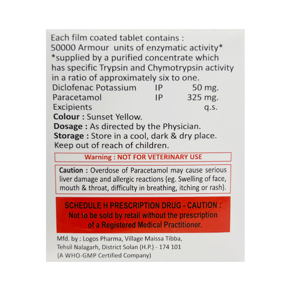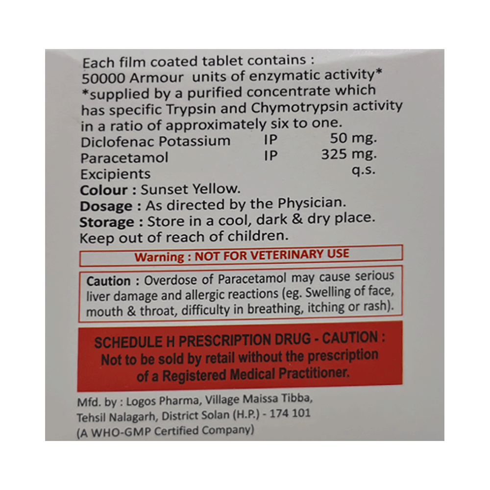 Salt Composition: Diclofenac (50mg) + Paracetamol (325mg) + Trypsin Chymotrypsin (50000AU)