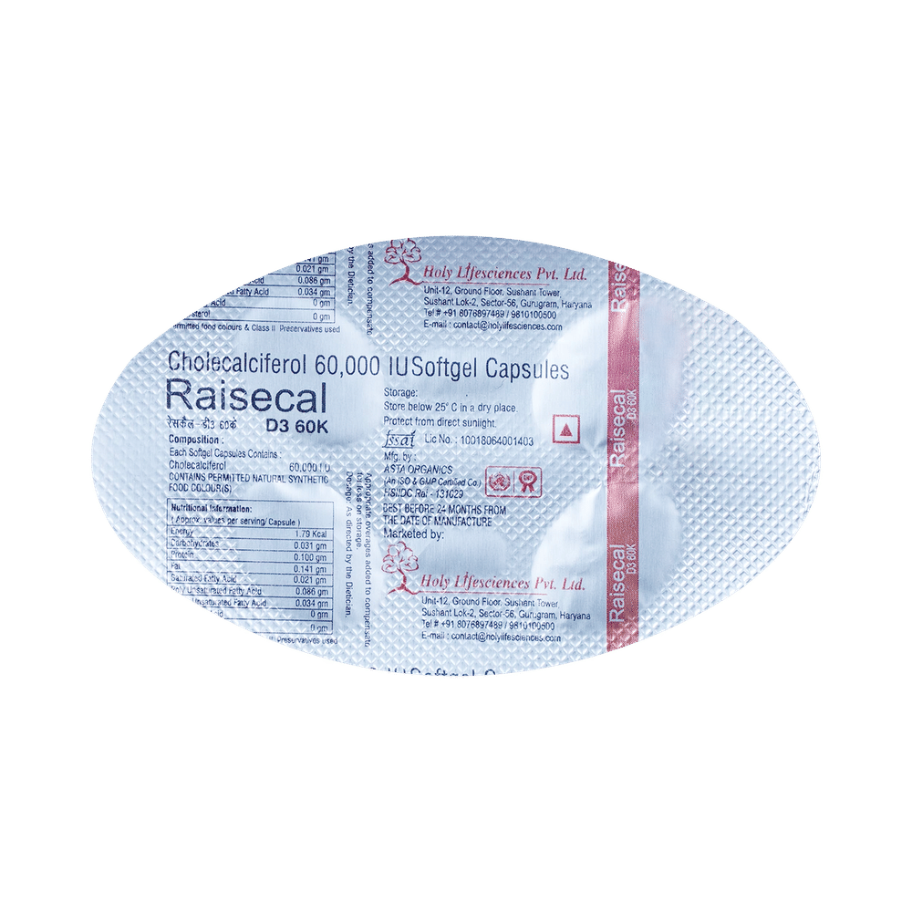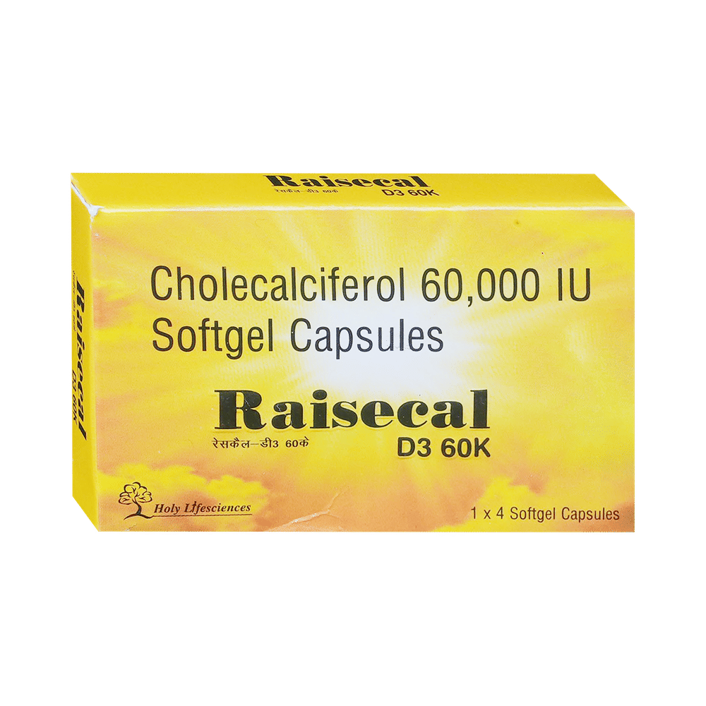 Raisecal D3 60K Softgel Capsule is a form of vitamin D. It raises vitamin D levels in your blood. This, in turn, increases calcium levels in your blood by helping you absorb more calcium from food.