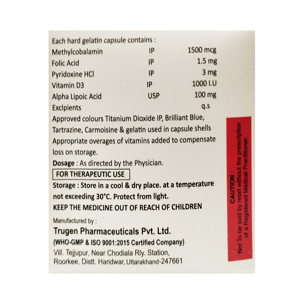 Salt Composition: Methylcobalamin (1500mcg) + Alpha Lipoic Acid (100mg) + Vitamin B6 (Pyridoxine) (3mg) + Folic Acid (1.5mg) + Vitamin D3 (1000IU)