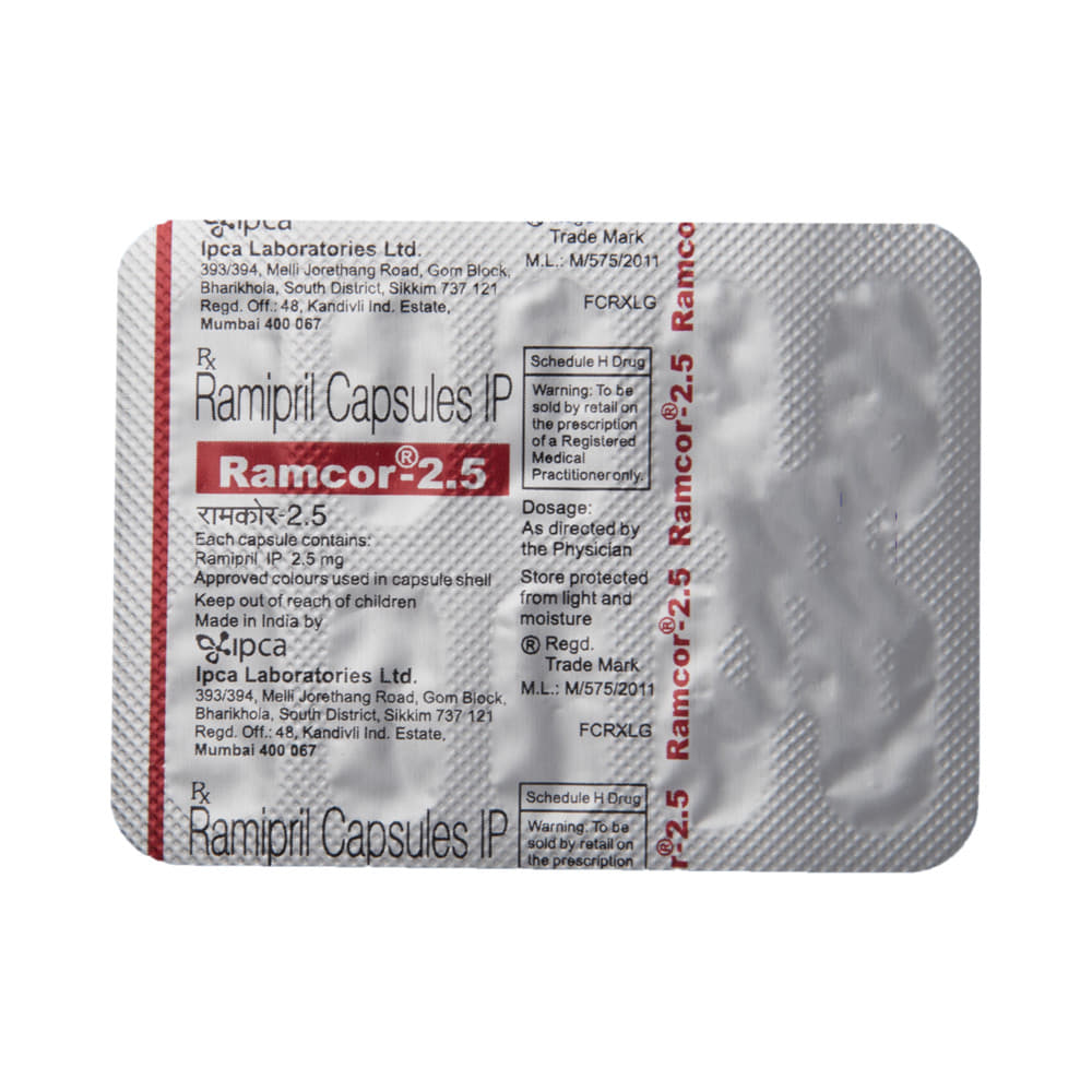 Ramcor 2.5 Capsule is widely used to treat high blood pressure and heart failure and may even be prescribed after a heart attack. It also lowers the chances of having a heart attack or stroke. Ramcor 2.5 Capsule may be prescribed either alone or in combination with other medicines. It can be taken on an empty stomach or with a meal. This medicine should preferably be taken at the same time each day to get the maximum benefit. It is important to continue taking it regularly even if you feel well or even if your blood pressure is controlled. Most people with high blood pressure do not feel any symptoms, but if you stop taking this medicine, your condition could get worse. This is a widely used medicine and is considered safe for long-term use. Making some changes in your lifestyle will also help lower your blood pressure. These may include regular exercise, losing weight, not smoking, reducing alcohol intake, and reducing the amount of salt in your diet as advised by your doctor.The most common side effects of this medicine include feeling dry cough, headache, and fatigue. Most of these are temporary and resolve with time. Talk to your doctor if any of the side effects bother you or do not go away.Before taking this medicine, let your doctor know if you have any kidney or liver problems. Pregnant or breastfeeding mothers should also consult their doctor before taking it. Your doctor may check your kidney function, blood pressure, and potassium levels in your blood at regular intervals while you are taking this medicine.