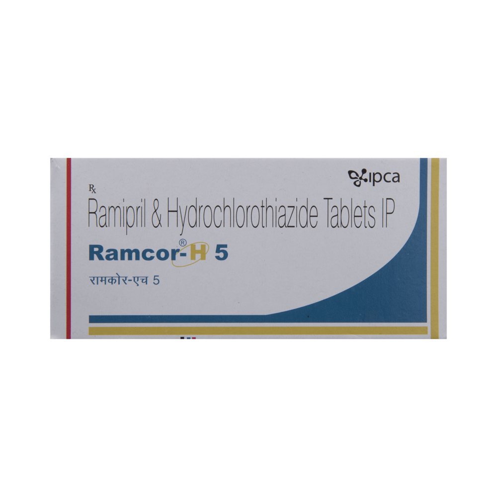 Ramcor-H 5 Tablet is a medicine used to treat hypertension (high blood pressure). It is a combination of two medicines that helps to control blood pressure when a single medication is not effective. It helps to reduce the chances of any future heart attack and stroke. Ramcor-H 5 Tablet is taken with or without food, preferably in the morning to avoid frequent urination at night. Keep taking it for as long as advised by your doctor. Even if you feel well, do not stop this medicine on your own because high blood pressure often has no symptoms. If you stop taking it, your condition may get worse. Keeping active with regular exercise, reducing your weight and eating a healthy diet will also help control your blood pressure. Follow your doctor’s advice while taking this medicine.Nausea, indigestion, taste change, and diarrhea are some common side effects of this medicine. Consult your doctor If any of these bother you, or get worse, or do not go away. Let your doctor know about cough or throat irritation that does not go away. Drink plenty of fluids while taking medicine to overcome muscle weakness, dry mouth, and extreme thirst. Dizziness may occur due to low blood pressure but this gets better with time.Before taking it, let your doctor know if you have any liver or kidney problems. Pregnant or breastfeeding women should also consult their doctor for advice before taking this medicine. You also need to tell your doctor what other medicines you are taking especially those used to treat high blood pressure or heart conditions. You should have your blood pressure, kidney function and the levels of salts such as potassium checked regularly to make sure that this medicine is working properly.