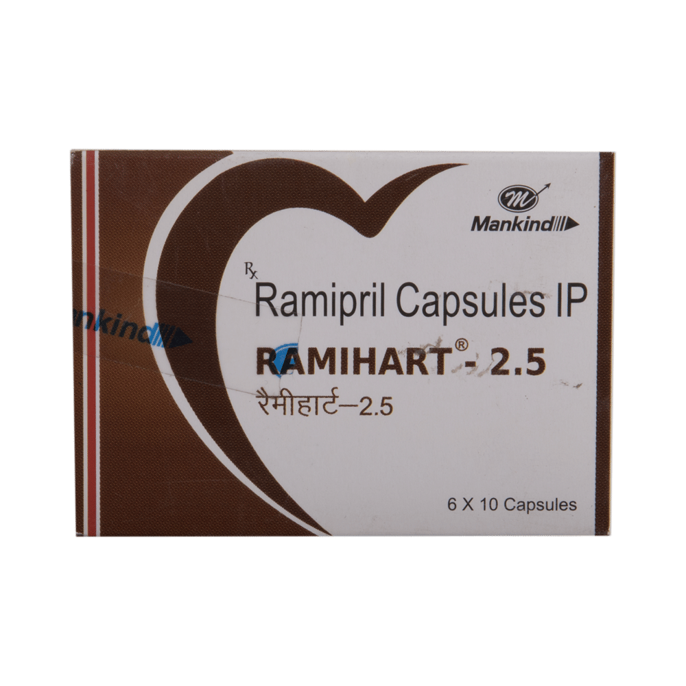 Ramihart 2.5 Capsule is widely used to treat high blood pressure and heart failure and may even be prescribed after a heart attack. It also lowers the chances of having a heart attack or stroke. Ramihart 2.5 Capsule may be prescribed either alone or in combination with other medicines. It can be taken on an empty stomach or with a meal. This medicine should preferably be taken at the same time each day to get the maximum benefit. It is important to continue taking it regularly even if you feel well or even if your blood pressure is controlled. Most people with high blood pressure do not feel any symptoms, but if you stop taking this medicine, your condition could get worse. This is a widely used medicine and is considered safe for long-term use. Making some changes in your lifestyle will also help lower your blood pressure. These may include regular exercise, losing weight, not smoking, reducing alcohol intake, and reducing the amount of salt in your diet as advised by your doctor.The most common side effects of this medicine include feeling dry cough, headache, and fatigue. Most of these are temporary and resolve with time. Talk to your doctor if any of the side effects bother you or do not go away.Before taking this medicine, let your doctor know if you have any kidney or liver problems. Pregnant or breastfeeding mothers should also consult their doctor before taking it. Your doctor may check your kidney function, blood pressure, and potassium levels in your blood at regular intervals while you are taking this medicine.