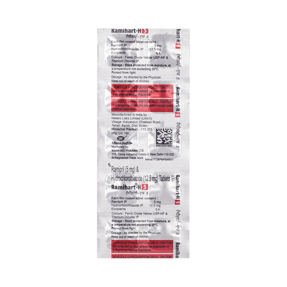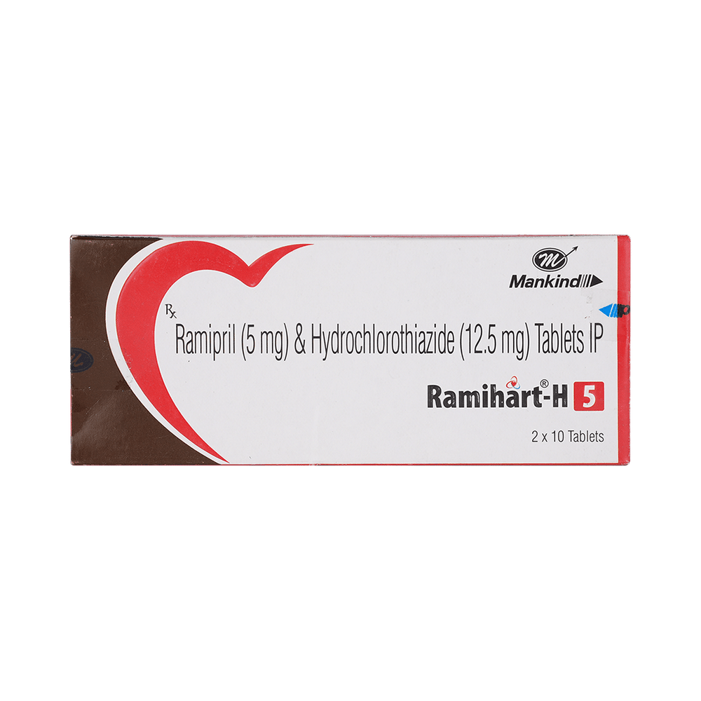 Ramihart-H 5 Tablet is a medicine used to treat hypertension (high blood pressure). It is a combination of two medicines that helps to control blood pressure when a single medication is not effective. It helps to reduce the chances of any future heart attack and stroke. Ramihart-H 5 Tablet is taken with or without food, preferably in the morning to avoid frequent urination at night. Keep taking it for as long as advised by your doctor. Even if you feel well, do not stop this medicine on your own because high blood pressure often has no symptoms. If you stop taking it, your condition may get worse. Keeping active with regular exercise, reducing your weight and eating a healthy diet will also help control your blood pressure. Follow your doctor’s advice while taking this medicine.Nausea, indigestion, taste change, and diarrhea are some common side effects of this medicine. Consult your doctor If any of these bother you, or get worse, or do not go away. Let your doctor know about cough or throat irritation that does not go away. Drink plenty of fluids while taking medicine to overcome muscle weakness, dry mouth, and extreme thirst. Dizziness may occur due to low blood pressure but this gets better with time.Before taking it, let your doctor know if you have any liver or kidney problems. Pregnant or breastfeeding women should also consult their doctor for advice before taking this medicine. You also need to tell your doctor what other medicines you are taking especially those used to treat high blood pressure or heart conditions. You should have your blood pressure, kidney function and the levels of salts such as potassium checked regularly to make sure that this medicine is working properly.