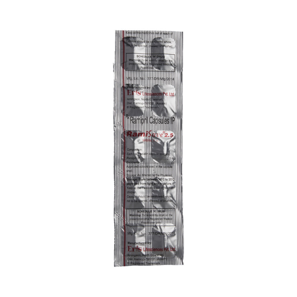 RAMIsave 2.5 Capsule is widely used to treat high blood pressure and heart failure and may even be prescribed after a heart attack. It also lowers the chances of having a heart attack or stroke. RAMIsave 2.5 Capsule may be prescribed either alone or in combination with other medicines. It can be taken on an empty stomach or with a meal. This medicine should preferably be taken at the same time each day to get the maximum benefit. It is important to continue taking it regularly even if you feel well or even if your blood pressure is controlled. Most people with high blood pressure do not feel any symptoms, but if you stop taking this medicine, your condition could get worse. This is a widely used medicine and is considered safe for long-term use. Making some changes in your lifestyle will also help lower your blood pressure. These may include regular exercise, losing weight, not smoking, reducing alcohol intake, and reducing the amount of salt in your diet as advised by your doctor.The most common side effects of this medicine include feeling dry cough, headache, and fatigue. Most of these are temporary and resolve with time. Talk to your doctor if any of the side effects bother you or do not go away.Before taking this medicine, let your doctor know if you have any kidney or liver problems. Pregnant or breastfeeding mothers should also consult their doctor before taking it. Your doctor may check your kidney function, blood pressure, and potassium levels in your blood at regular intervals while you are taking this medicine.