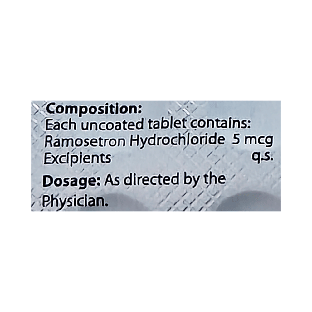 Ramobliss 5mcg Tablet is an anti-emetic medicine used to prevent nausea and vomiting in cancer patients during and after chemotherapy or radiotherapy. Additionally, it is used to treat diarrhea in patients with irritable bowel syndrome symptoms. Ramobliss 5mcg Tablet will not relieve other side effects associated with cancer treatments. It also has little effect on vomiting caused by motion sickness. You should take this medicine in the dose and duration advised by your doctor. But, it is better to take this medicine at a fixed time. Remember you should not stop taking the medication suddenly without talking to your doctor. In case you vomit within one hour of taking a dose then take another dose and avoid heavy meals throughout the day.The most common side effects of taking this medicine include headache, diarrhea, rashes, and constipation. These symptoms should disappear when you stop taking the medicine. However, if these bother you or do not go away, your doctor may be able to suggest ways of preventing or reducing them.Before taking this medicine, tell your doctor if you have heart or liver problems or a blockage in your stomach or intestines. Also, tell your doctor about any other medicine you are using, especially medicines to treat epilepsy, heart problems, cancer, and depression. These may affect, or be affected by, this medicine. If you are pregnant or breastfeeding, ask for advice from your healthcare team.