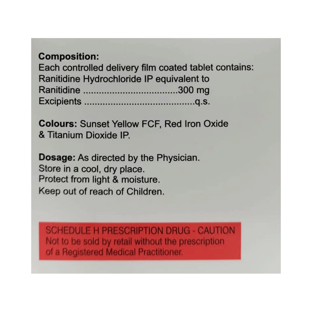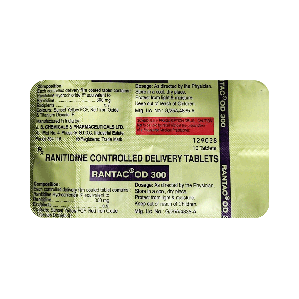 Rantac OD 300 Tablet CR is a medicine that reduces the amount of acid your stomach makes. It is used to treat and prevent heartburn, indigestion, and other symptoms caused by too much acid in the stomach. It is also used to treat and prevent stomach ulcers, reflux disease, and some rarer conditions. Rantac OD 300 Tablet CR is also commonly prescribed to prevent stomach ulcers and heartburn seen with the use of painkillers. The medicine must be taken in dose and duration as prescribed by the doctor. How much you need, and how often you take it, will depend on what you are being treated for. Follow the advice of your doctor. This medicine should relieve indigestion and heartburn within a few hours and you may only need to take it for a short time when you have symptoms. If you are taking it to prevent ulcers and other conditions you may need to take it for longer. You should keep taking it regularly to prevent problems from happening in the future. You may be able to help improve your symptoms by eating smaller meals more often and avoiding spicy or fatty foods.Most people who take it do not have any side effects but the most common include headache, constipation, feeling drowsy or tired, and diarrhea. If you do get a side effect, it is usually mild and will go away when you stop taking this medicine or as you adjust to it. Consult your doctor if any of these side effects bother you or do not go away.Before taking it, you should tell your doctor if you have any kidney or liver problems. This may affect the dose or suitability of this medicine. Also tell your doctor what other medicines you are taking as some may affect, or be affected by, this medicine. This medicine is usually considered safe to take during pregnancy and breastfeeding if it has been prescribed by a doctor. Avoid drinking alcohol as this can increase the amount of acid in your stomach and make your symptoms worse.