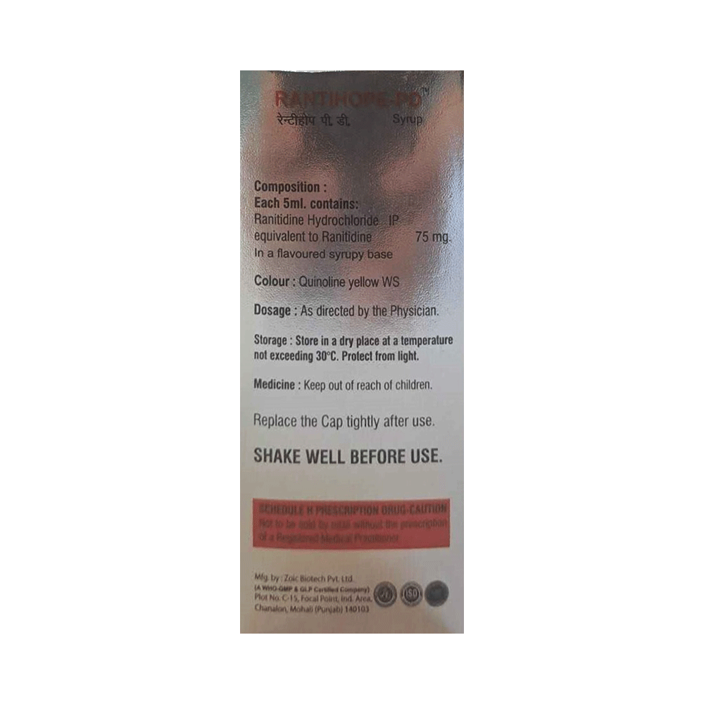 Rantihope-PD Syrup Mango is a medicine that reduces the amount of acid your stomach makes. It is used to treat and prevent heartburn, indigestion, and other symptoms caused by too much acid in the stomach. It is also used to treat and prevent stomach ulcers, reflux disease, and some rarer conditions. Rantihope-PD Syrup Mango is also commonly prescribed to prevent stomach ulcers and heartburn seen with the use of painkillers. The medicine must be taken in dose and duration as prescribed by the doctor. How much you need, and how often you take it, will depend on what you are being treated for. Follow the advice of your doctor. This medicine should relieve indigestion and heartburn within a few hours and you may only need to take it for a short time when you have symptoms. If you are taking it to prevent ulcers and other conditions you may need to take it for longer. You should keep taking it regularly to prevent problems from happening in the future. You may be able to help improve your symptoms by eating smaller meals more often and avoiding spicy or fatty foods.Most people who take it do not have any side effects but the most common include headache, constipation, feeling drowsy or tired, and diarrhea. If you do get a side effect, it is usually mild and will go away when you stop taking this medicine or as you adjust to it. Consult your doctor if any of these side effects bother you or do not go away.Before taking it, you should tell your doctor if you have any kidney or liver problems. This may affect the dose or suitability of this medicine. Also tell your doctor what other medicines you are taking as some may affect, or be affected by, this medicine. This medicine is usually considered safe to take during pregnancy and breastfeeding if it has been prescribed by a doctor. Avoid drinking alcohol as this can increase the amount of acid in your stomach and make your symptoms worse.