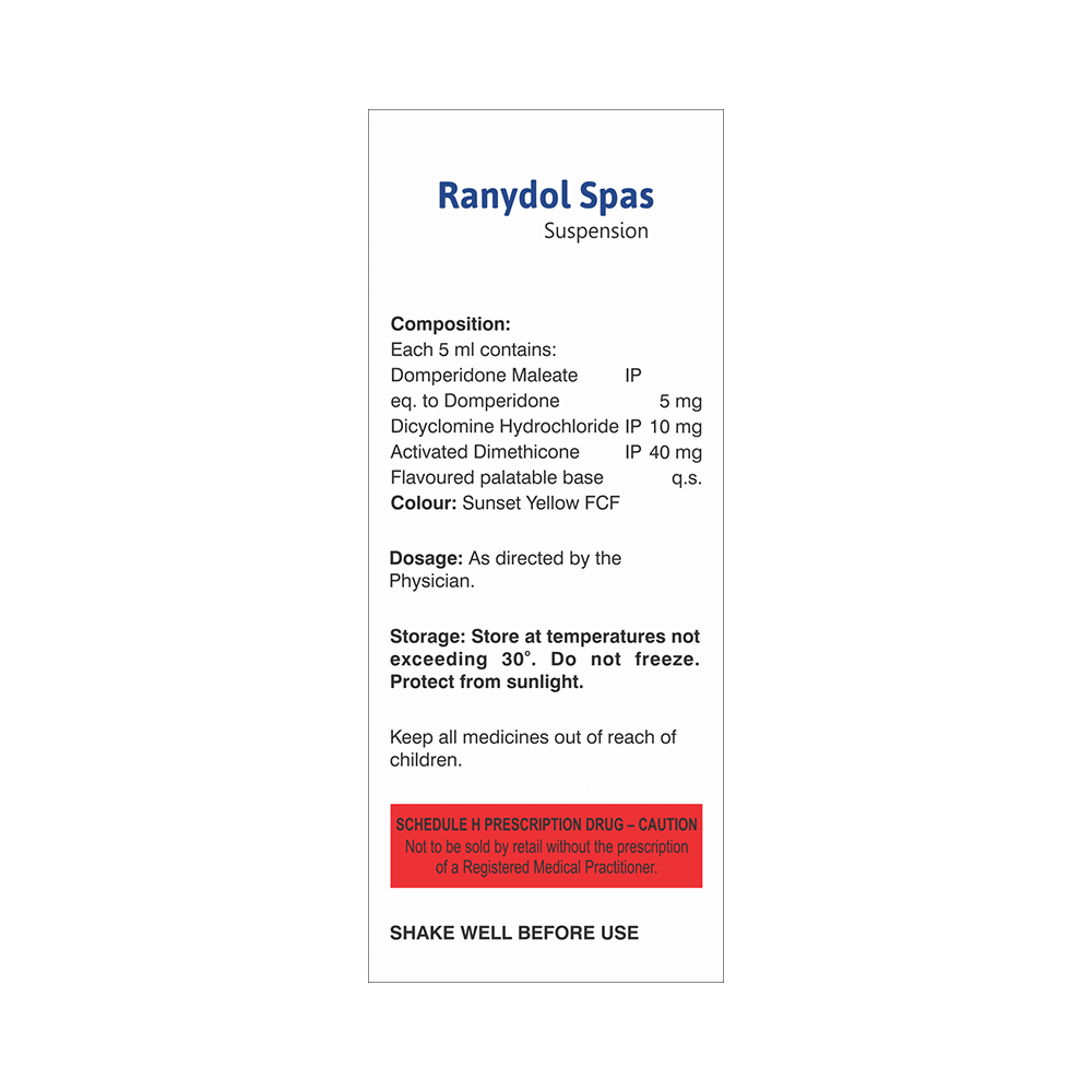 Ranydol Spas Oral Suspension is a combination of three medicines: domperidone, dicyclomine, and simethicone. Dicyclomine, an antispasmodic, relaxes the smooth muscles of the intestines, reducing abdominal cramps and pain. Domperidone, a prokinetic agent, enhances gastric emptying and prevents acid reflux, helping with heartburn and bloating. Simethicone, an antiflatulent, breaks down gas bubbles in the digestive tract, easing bloating and flatulence. Together, these ingredients provide effective relief, improving digestion and overall comfort.