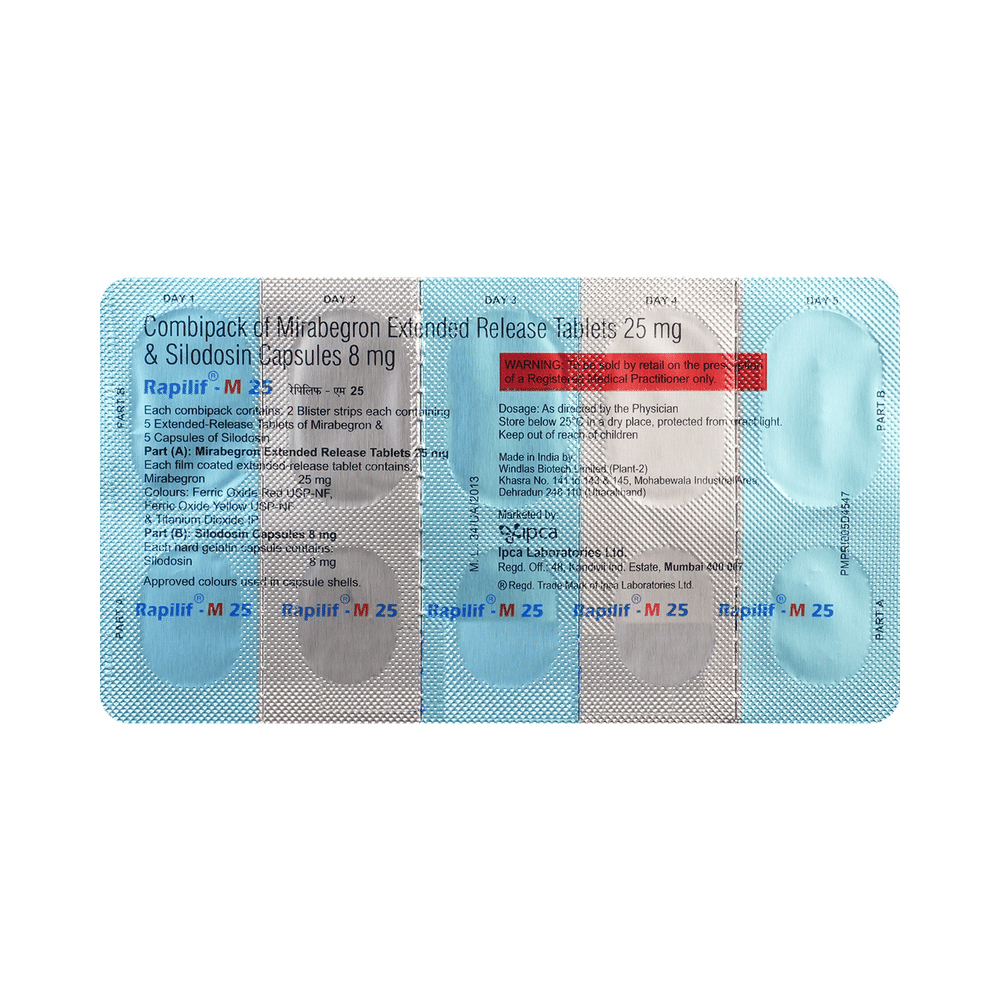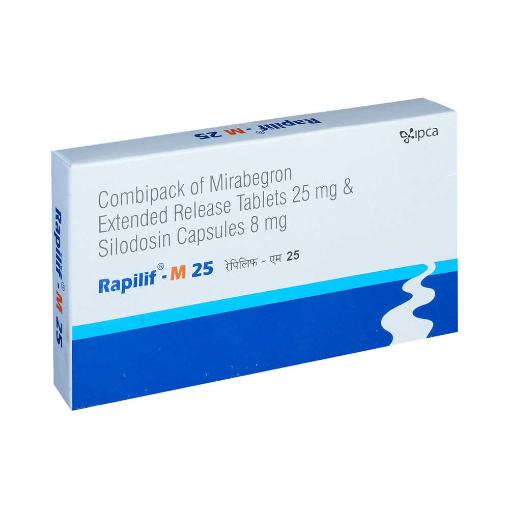 Rapilif-M 25 Kit is a combination of mirabegron and silodosin. Mirabegron relaxes the bladder muscles to prevent urgent, frequent, or uncontrolled urination. Silodosin relaxes the muscles of the bladder and prostate.