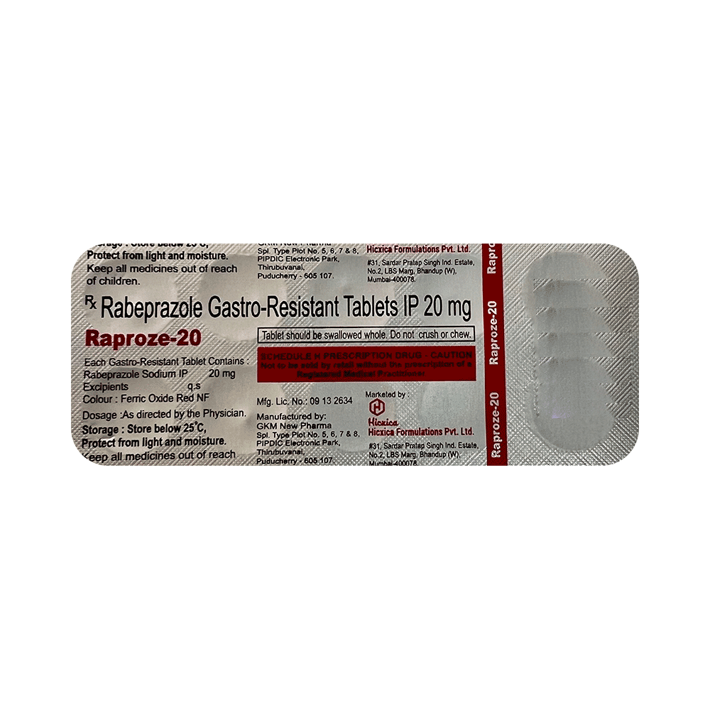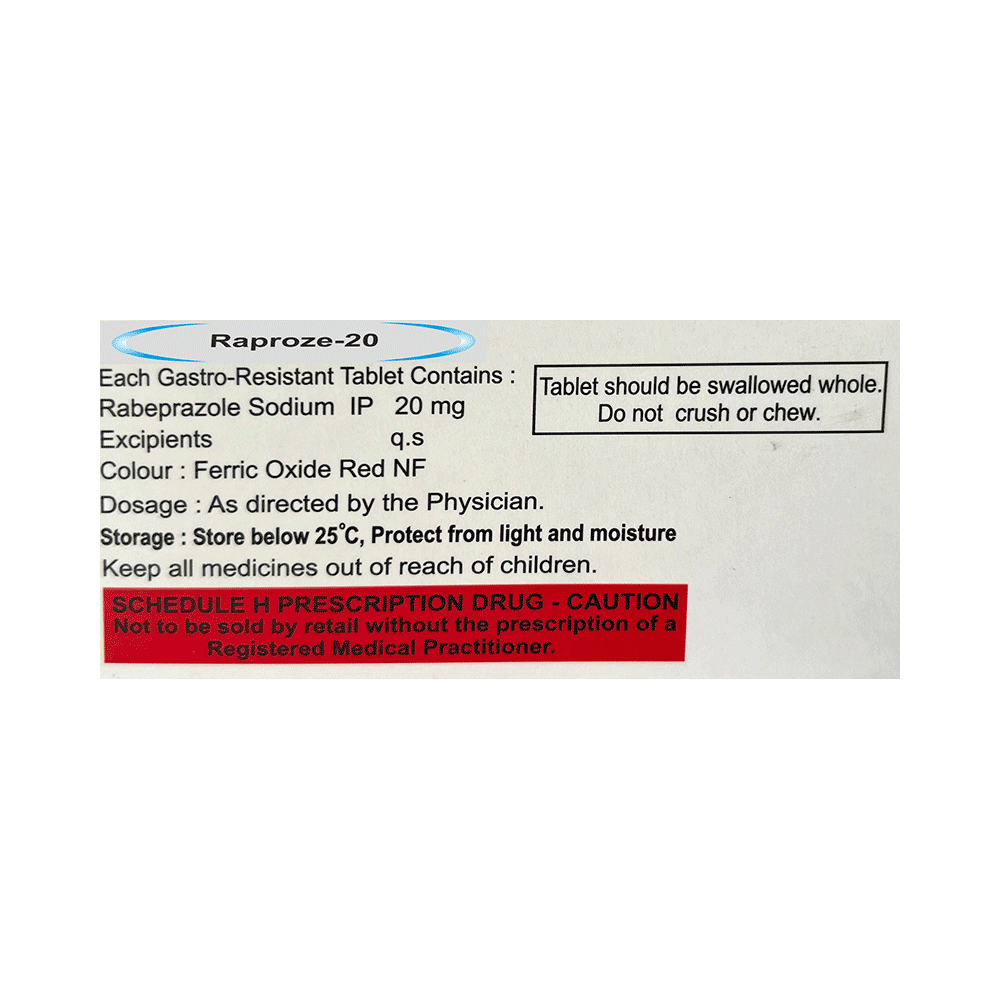 Raproze 20 Tablet is a medicine that reduces the amount of acid produced in your stomach. It is used in the treatment of acid-related diseases of the stomach and intestine such as acid reflux, peptic ulcer disease, and Zollinger-Ellison syndrome. It provides relief from symptoms and promotes healing. Raproze 20 Tablet medicine should be taken one hour before a meal, preferably in the morning. The dose will depend on your underlying condition and how you respond to the medicine. Try to take it regularly at the same time each day as advised by your doctor. You should keep on taking it as prescribed even if your symptoms disappear quickly. You may be able to help improve your symptoms by eating smaller meals more often and avoiding caffeinated drinks like tea and coffee, and spicy or fatty foods.This medicine's most common side effects include nausea, vomiting, headache, dizziness, flatulence, diarrhea, and stomach pain. These tend to be mild but talk to your doctor if they bother you or do not go away. The risk of side effects may increase the longer you take this medicine. Long-term use (more than 1 year) may increase your risk for bone fractures, especially with higher doses. Talk to your doctor about ways to prevent bone loss (osteoporosis), like taking calcium and vitamin D supplements.Low blood magnesium levels (hypomagnesemia) have been seen in some people taking this medicine for 3 months or more. This may lead to tiredness, confusion, dizziness, muscle twitches, and an irregular heartbeat. Your doctor may monitor your magnesium levels to prevent this.Raproze 20 Tablet is not suitable for some people. Before taking this medicine, you need to tell your doctor if you have severe liver problems, are taking medicines for HIV, have ever had an allergic reaction to similar medicines in the past, or suffer from bone loss (osteoporosis). Pregnant or breastfeeding women should also consult their doctor before taking it. Avoid drinking alcohol as it makes your stomach produce excessive acid and can worsen your symptoms. Do not drive or use machinery or tools, if this medicine makes you feel dizzy or sleepy.