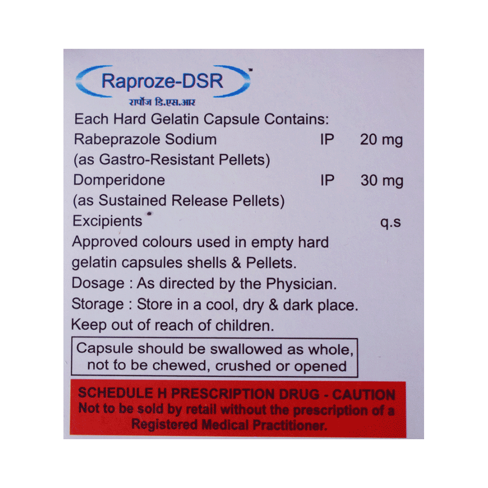 In Treatment of Gastroesophageal reflux disease (Acid reflux)Gastroesophageal reflux disease (GERD) is a chronic (long-term) condition in which there is an excess production of acid in the stomach. Raproze-DSR Capsule reduces the amount of acid your stomach makes and relieves the pain associated with heartburn and acid reflux. You should take it exactly as it is prescribed for it to be effective. Some simple lifestyle changes can help reduce the symptoms of GERD. Think about what foods trigger heartburn and try to avoid them; eat smaller, more frequent meals; try to lose weight if you are overweight, and try to find ways to relax. Do not eat within 3-4 hours of going to bed.In Treatment of Peptic ulcer diseasePeptic ulcer disease is a condition in which painful sores or ulcers develop in the inner lining of the stomach or gut (intestine). Raproze-DSR Capsule reduces the amount of acid your stomach makes which prevents further damage to the ulcer as it heals naturally. You may be given other medicines along with this medicine depending on what caused the ulcer. You need to keep taking the medicine as it is prescribed for it to be effective, even if the symptoms seem to disappear.show moreshow less