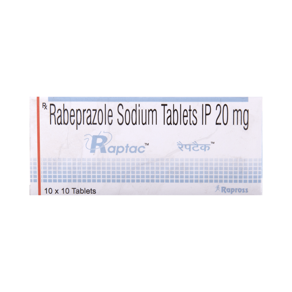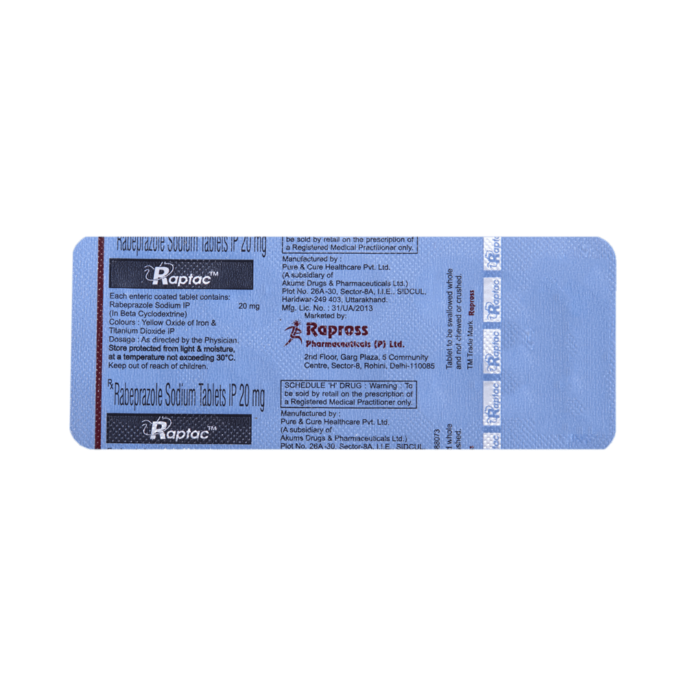 Raptac Tablet is a medicine that reduces the amount of acid produced in your stomach. It is used in the treatment of acid-related diseases of the stomach and intestine such as acid reflux, peptic ulcer disease, and Zollinger-Ellison syndrome. It provides relief from symptoms and promotes healing. Raptac Tablet medicine should be taken one hour before a meal, preferably in the morning. The dose will depend on your underlying condition and how you respond to the medicine. Try to take it regularly at the same time each day as advised by your doctor. You should keep on taking it as prescribed even if your symptoms disappear quickly. You may be able to help improve your symptoms by eating smaller meals more often and avoiding caffeinated drinks like tea and coffee, and spicy or fatty foods.This medicine's most common side effects include nausea, vomiting, headache, dizziness, flatulence, diarrhea, and stomach pain. These tend to be mild but talk to your doctor if they bother you or do not go away. The risk of side effects may increase the longer you take this medicine. Long-term use (more than 1 year) may increase your risk for bone fractures, especially with higher doses. Talk to your doctor about ways to prevent bone loss (osteoporosis), like taking calcium and vitamin D supplements.Low blood magnesium levels (hypomagnesemia) have been seen in some people taking this medicine for 3 months or more. This may lead to tiredness, confusion, dizziness, muscle twitches, and an irregular heartbeat. Your doctor may monitor your magnesium levels to prevent this.Raptac Tablet is not suitable for some people. Before taking this medicine, you need to tell your doctor if you have severe liver problems, are taking medicines for HIV, have ever had an allergic reaction to similar medicines in the past, or suffer from bone loss (osteoporosis). Pregnant or breastfeeding women should also consult their doctor before taking it. Avoid drinking alcohol as it makes your stomach produce excessive acid and can worsen your symptoms. Do not drive or use machinery or tools, if this medicine makes you feel dizzy or sleepy.