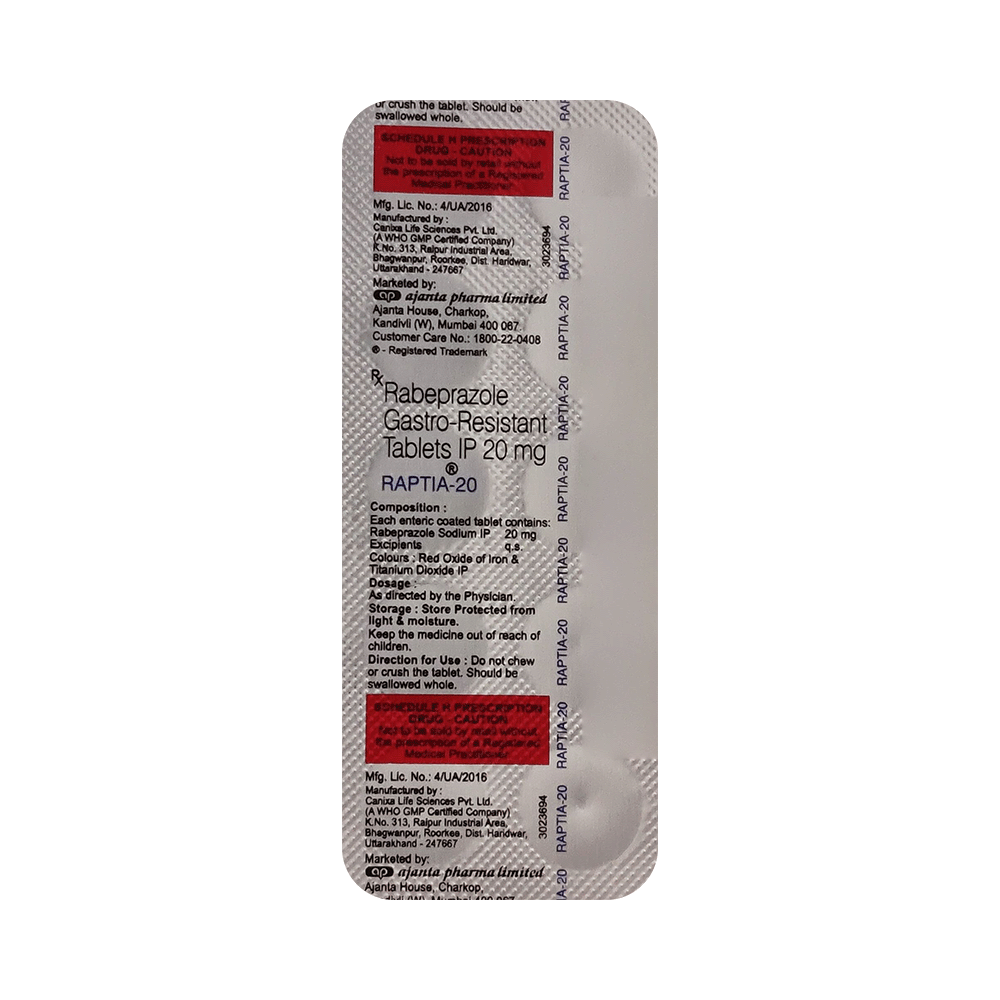 Raptia 20mg Tablet is a medicine that reduces the amount of acid produced in your stomach. It is used in the treatment of acid-related diseases of the stomach and intestine such as acid reflux, peptic ulcer disease, and Zollinger-Ellison syndrome. It provides relief from symptoms and promotes healing. Raptia 20mg Tablet medicine should be taken one hour before a meal, preferably in the morning. The dose will depend on your underlying condition and how you respond to the medicine. Try to take it regularly at the same time each day as advised by your doctor. You should keep on taking it as prescribed even if your symptoms disappear quickly. You may be able to help improve your symptoms by eating smaller meals more often and avoiding caffeinated drinks like tea and coffee, and spicy or fatty foods.This medicine's most common side effects include nausea, vomiting, headache, dizziness, flatulence, diarrhea, and stomach pain. These tend to be mild but talk to your doctor if they bother you or do not go away. The risk of side effects may increase the longer you take this medicine. Long-term use (more than 1 year) may increase your risk for bone fractures, especially with higher doses. Talk to your doctor about ways to prevent bone loss (osteoporosis), like taking calcium and vitamin D supplements.Low blood magnesium levels (hypomagnesemia) have been seen in some people taking this medicine for 3 months or more. This may lead to tiredness, confusion, dizziness, muscle twitches, and an irregular heartbeat. Your doctor may monitor your magnesium levels to prevent this.Raptia 20mg Tablet is not suitable for some people. Before taking this medicine, you need to tell your doctor if you have severe liver problems, are taking medicines for HIV, have ever had an allergic reaction to similar medicines in the past, or suffer from bone loss (osteoporosis). Pregnant or breastfeeding women should also consult their doctor before taking it. Avoid drinking alcohol as it makes your stomach produce excessive acid and can worsen your symptoms. Do not drive or use machinery or tools, if this medicine makes you feel dizzy or sleepy.