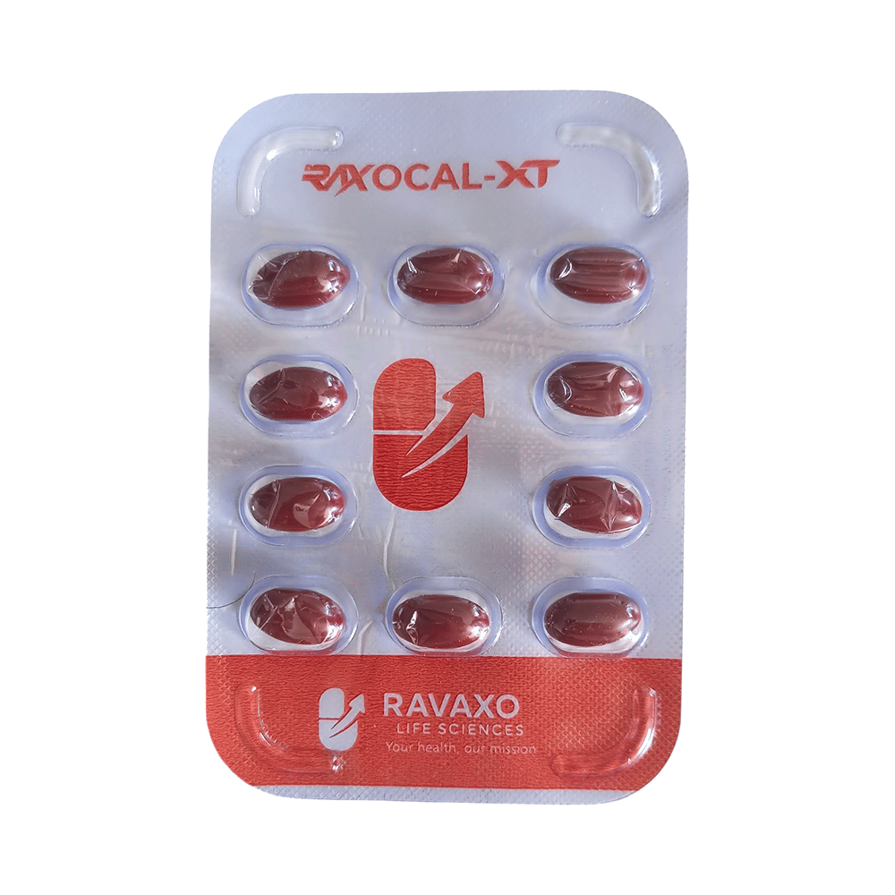 Raxocal-XT Softgel Capsule is a combination medicine used to treat nutritional deficiencies. It is normally prescribed when your diet alone cannot provide the necessary supplements your body needs. It fulfills the deficiency to prevent related diseases. It also ensures proper growth and functioning of the body. Raxocal-XT Softgel Capsule may be taken with or without food. Take it in the dose and duration advised by the doctor. Take it regularly at the same time each day to get maximum benefits from it. Do not take it more than or longer than prescribed by the doctor, as that may cause harmful effects.It is generally safe medicine with little or no side effects. However, some people may experience dryness in the mouth, nausea, abdominal pain, constipation, and headache on taking the medicine. If you experience any such side effects which do not go away on their own or get worse, let your doctor know. It is important to let your doctor know if you have any preexisting medical conditions or if you are taking any other medications. This will ensure your safety to use this medicine.