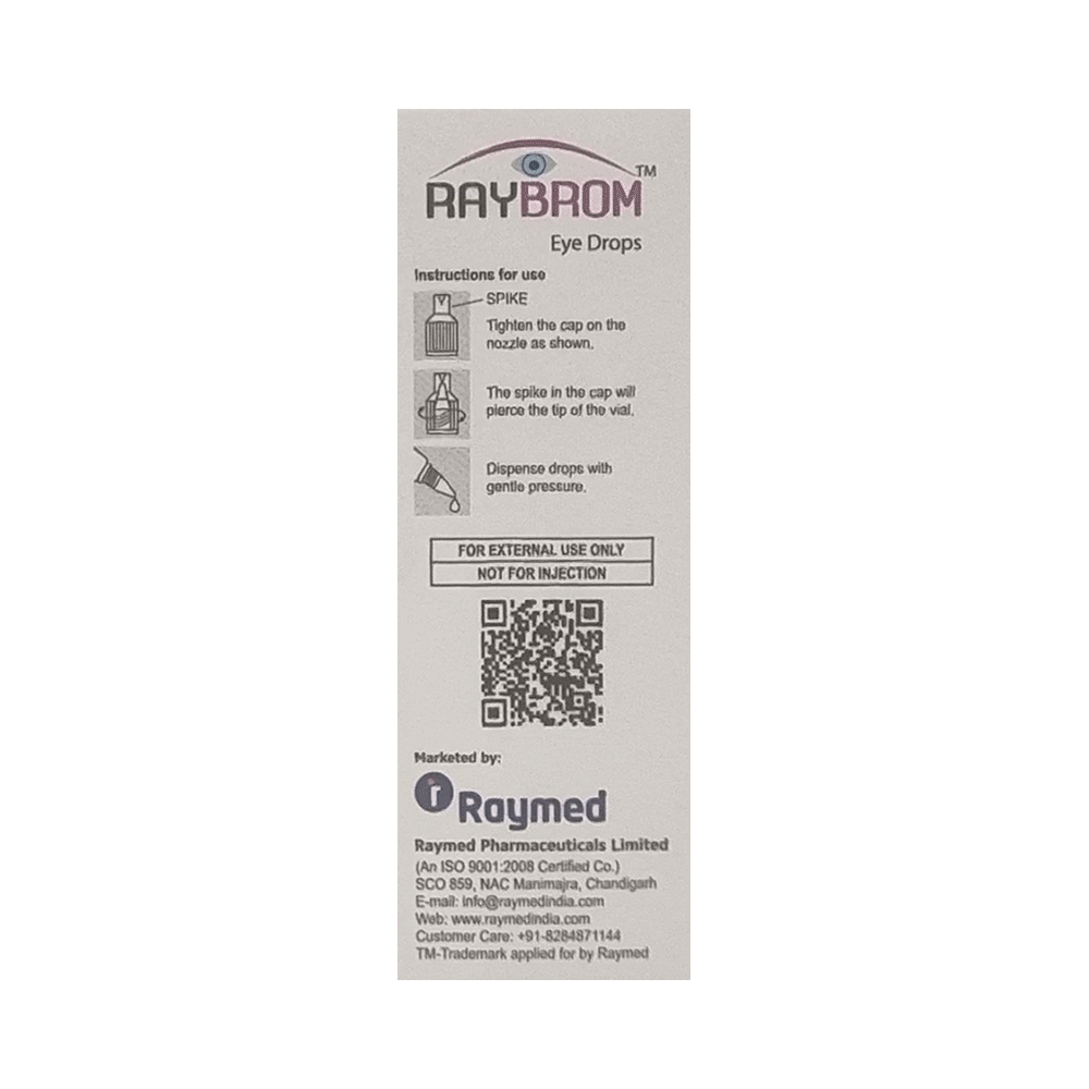 Raybrom Eye Drop is a pain-relieving medicine. It is used to treat postoperative eye pain and inflammation in patients who have undergone cataract surgery. Always wash your hands before using Raybrom Eye Drop. Use only the number of drops that your doctor has prescribed and wait for about five minutes between each drop. If you wear contact lenses, remove them before using the drops and wait for at least 15 minutes before putting them back in. You should not touch the tip of the dropper or bottle. This may lead to infection.Use of the medicine may cause blurred vision, increased sensitivity to light, change in color vision, decreased vision, eye pain, sore eyes, teary eye, and headache. These are usually temporary and resolve with time. However, if they persist or get worse, you should let your doctor know. Your doctor may be able to suggest ways of preventing or reducing the symptoms.Before using this medicine, you should tell your doctor about all the other medicines you are taking. You should also tell your doctor if you have any other medical conditions or disorders. Pregnant and breastfeeding women should consult with their doctors before using the medicine.