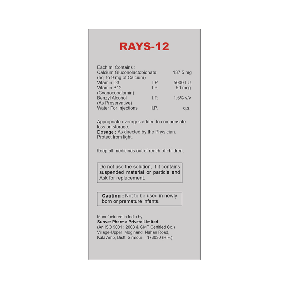 Rays 12 Injection is a combination of three nutritional supplements: Calcium, Vitamin D3 and Methylcobalamin which replenish the body's stores of important nutrients.