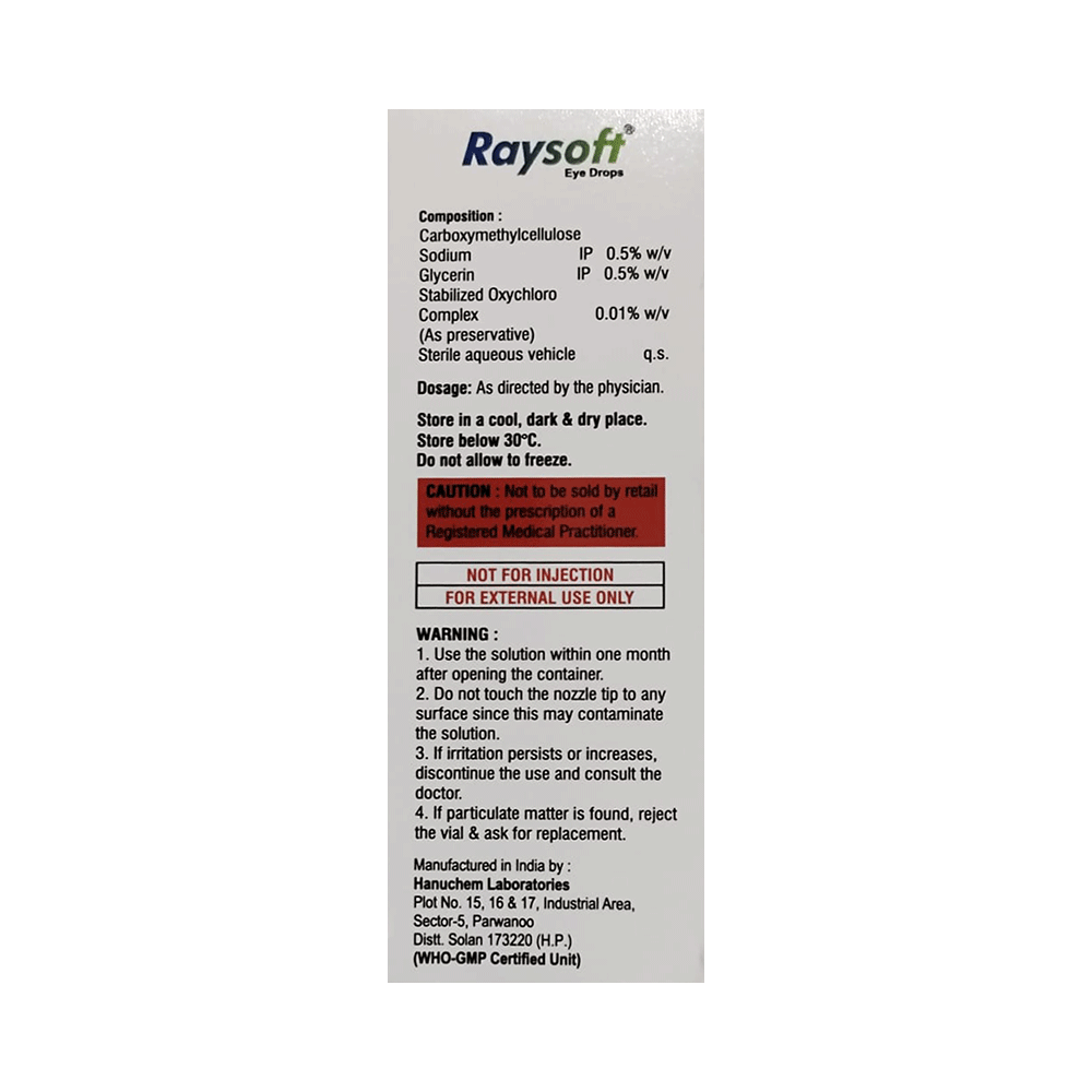 Raysoft Eye Drop is a combination of two lubricants: Carboxymethylcellulose and Glycerin which treat dry eyes. It works by lubricating the eyes to provide temporary relief from burning and discomfort.