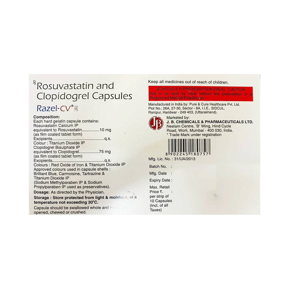 Razel-CV 10/75 Capsule is a medicine used to prevent heart attack, angina, and stroke. This medicine reduces the "bad" cholesterol (LDL) and triglycerides (fats) levels. Moreover, it also decreases the formation of harmful blood clots and helps improve heart health. Razel-CV 10/75 Capsule should be taken with or without food. You should take it regularly at evenly spaced intervals as per the schedule prescribed by your doctor. Taking it at the same time every day will help you remember to take it. The dose and duration of treatment will depend on what you are being treated for. Do not stop taking it until you have finished the complete course, even when you feel better. Incorporating healthy lifestyle changes like a low-fat diet, exercise, and not smoking can help this medicine work better.Common side effects of Razel-CV 10/75 Capsule include stomach pain, constipation, nausea, muscle cramps, bleeding, and headache. These symptoms may vary from person to person. Inform the doctor if these symptoms get worse or last longer, and get medical advice if you experience any additional side effects.This medicine increases your risk of bleeding, so it is important to be careful while shaving, cutting nails, using sharp objects, or engaging in contact sports (e.g., football or wrestling). Let your doctor know if you notice yellowing of the skin, muscle pain, or dark urine.You may be asked to undergo regular monitoring of liver function while taking this medicine. Before taking this medicine, tell your doctor if you have liver or kidney disease or if you are suffering from a bleeding disorder. You must tell your doctor if you are pregnant, planning pregnancy, or breastfeeding. You should also let your doctor know all the other medicines you are taking, as they may affect or be affected by this medicine. Lifestyle changes like a low-fat diet, exercise, and not smoking may help this medicine work better.