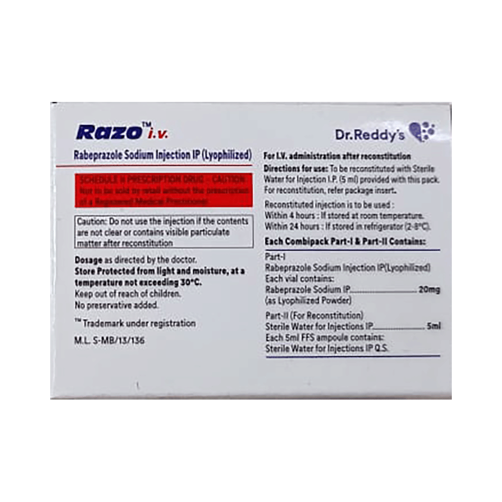 Razo IV Injection is a medicine that reduces the amount of acid produced in your stomach. It is used for treating acid-related diseases of the stomach and intestine such as acid reflux, indigestion, peptic ulcer disease, and some other stomach conditions associated with excessive acid production. Razo IV Injection is fast-acting and provides quick relief from acidity-related problems. It is also used to prevent stress ulcers in seriously ill patients and is administered before anesthetic medication to help prevent aspiration-related complications. It belongs to a class of medicines known as proton pump inhibitors (PPIs).This medicine is administered into a vein by a healthcare professional and will only be given to you if your doctor thinks that an injection is more suitable for you at the moment than a tablet. The dose will depend on your underlying condition and how you respond to the medicine. Your doctor will decide the duration of treatment but you should keep on taking it as prescribed, even if your symptoms disappear quickly. You can increase the efficiency of the treatment by eating smaller meals more often and avoiding caffeinated drinks (like tea and coffee), and spicy or fatty foods.The most common side effects observed with this medicine include nausea, vomiting, headache, dizziness, flatulence, diarrhea, stomach pain, and thrombophlebitis (pain, redness, and swelling of the vein). These symptoms are generally mild but if they bother you or do not go away, consult your doctor. Long-term use of this medicine may lead to an increased risk of side effects. For instance, using this medicine for more than 1 year may increase your risk for bone fractures, especially with higher doses. Talk to your doctor about ways to prevent bone loss (osteoporosis), like taking calcium and vitamin D supplements.Low blood magnesium levels (hypomagnesemia) have been observed in some people taking this medicine for 3 months or more. These reduced levels of magnesium may lead to tiredness, confusion, dizziness, muscle twitches, and an irregular heartbeat. Your doctor may monitor your magnesium levels to prevent this.Razo IV Injection is not suitable for some people. Before taking this medicine, you need to tell your doctor if you have severe liver problems, are taking medicines for HIV, have ever had an allergic reaction to similar medicines in the past, or suffer from bone loss (osteoporosis). Pregnant or breastfeeding women should also consult their doctor before taking it. Avoid drinking alcohol as it makes your stomach produce excessive acid and can worsen your symptoms. Do not drive or use machinery or tools, if this medicine makes you feel dizzy or sleepy.
