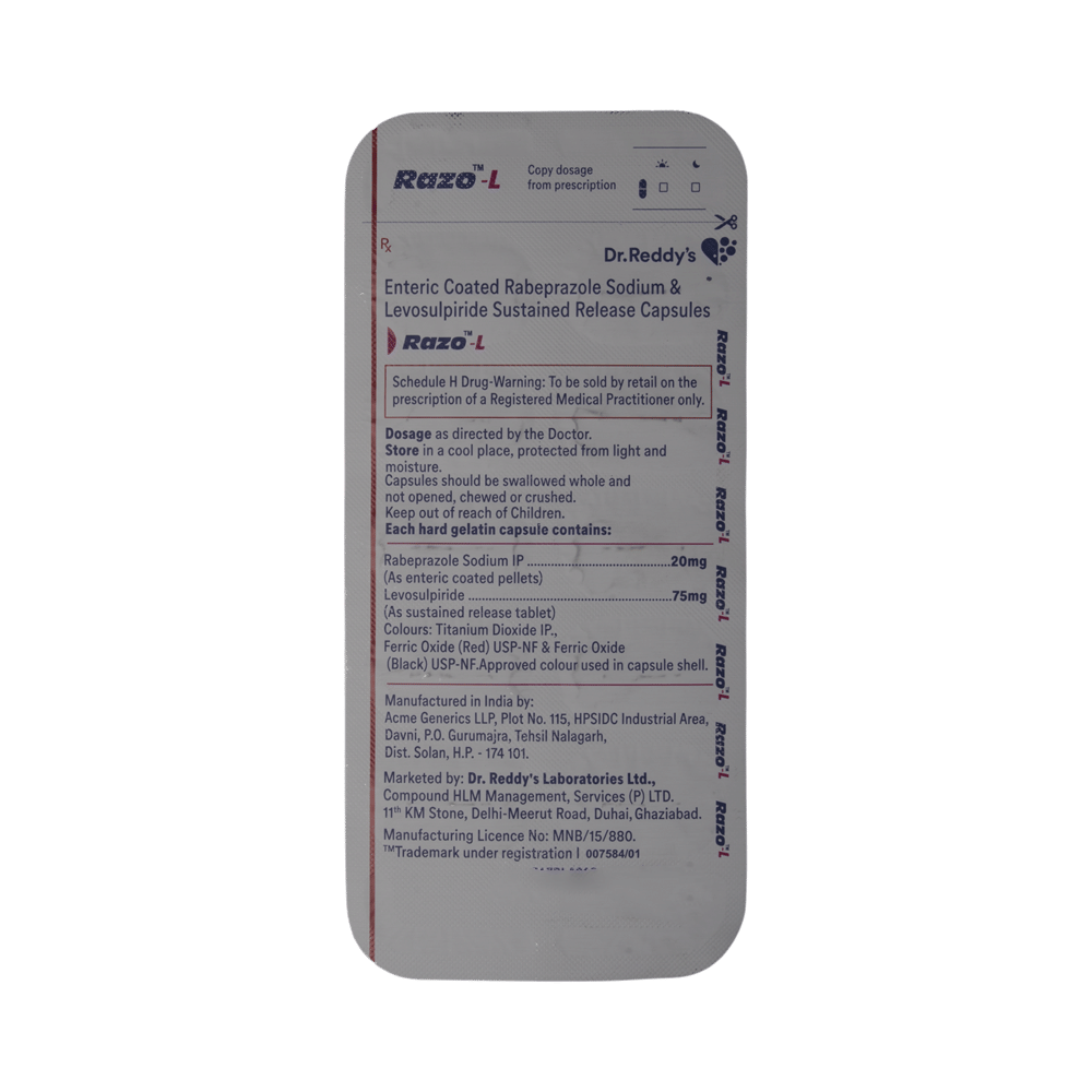 Razo-L Capsule SR is a prescription medicine which is used in the treatment of gastroesophageal reflux disease (acid reflux), intestinal ulcers, and irritable bowel syndrome. It reduces excess acid production in the stomach and prevents the reflux of stomach acid into the food pipe. Razo-L Capsule SR is taken with or without food in a dose and duration as advised by the doctor. The dose you are given will depend on your condition and how you respond to the medicine. You should keep taking this medicine for as long as your doctor recommends. If you stop treatment too early your symptoms may come back and your condition may worsen. Let your healthcare team know about all other medications you are taking as some may affect, or be affected by this medicine.The most common side effects are nausea, stomach pain, diarrhea, flatulence, constipation, headache, weakness, and flu-like symptoms. Most of these are temporary and usually resolve with time. Contact your doctor straight away if you are at all concerned about any of these side effects. It may also cause dizziness and sleepiness, so do not drive or do anything that requires mental focus until you know how this medicine affects you. Avoid drinking alcohol while taking this medicine as it can worsen your sleepiness.Lifestyle modifications like having fiber-rich diet, avoiding foods that trigger your symptoms, increasing fluid intake and regular exercise can help you to get better results. Before taking it, you should tell your doctor if you have any kidney or liver diseases. You should also tell your doctor if you are pregnant, planning pregnancy or breastfeeding.