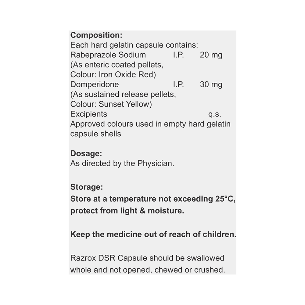 Razrox DSR Capsule is a combination medicine used to treat gastroesophageal reflux disease (acid reflux). It works by relieving the symptoms of acidity such as heartburn, stomach pain, or irritation. It also neutralizes the acid and promotes easy passage of gas to reduce stomach discomfort. Razrox DSR Capsule is taken without food in a dose and duration as advised by the doctor. The dose you are given will depend on your condition and how you respond to the medicine. You should keep taking this medicine for as long as your doctor recommends. If you stop treatment too early your symptoms may come back and your condition may worsen. Let your healthcare team know about all other medications you are taking as some may affect, or be affected by this medicine.The most common side effects are diarrhea, stomach pain, dryness in the mouth, headache, flatulence, and weakness. Most of these are temporary and usually resolve with time. Contact your doctor straight away if you are at all concerned about any of these side effects. This medicine may cause dizziness and sleepiness, so do not drive or do anything that requires mental focus until you know how this medicine affects you. Avoid drinking alcohol while taking this medicine as it can worsen your sleepiness. Lifestyle modifications like having cold milk and avoiding hot tea, coffee, spicy food or chocolate can help you to get better results.Before you start taking this medicine it is important to inform your doctor if you are suffering from kidney or liver disease. You should also tell your doctor if you are pregnant, planning pregnancy or breastfeeding.