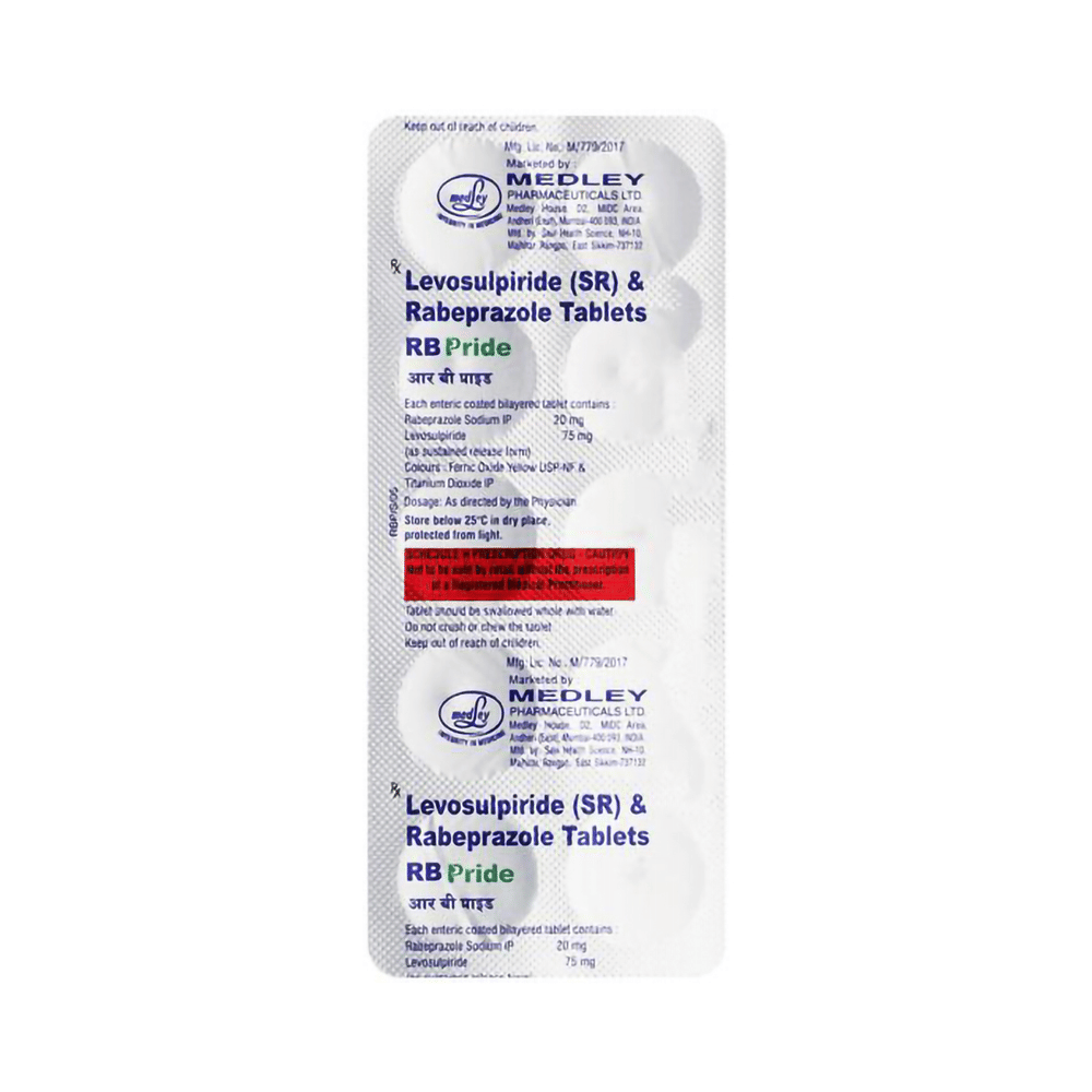 RB Pride Tablet is a prescription medicine which is used in the treatment of gastroesophageal reflux disease (acid reflux), intestinal ulcers, and irritable bowel syndrome. It reduces excess acid production in the stomach and prevents the reflux of stomach acid into the food pipe. RB Pride Tablet is taken with or without food in a dose and duration as advised by the doctor. The dose you are given will depend on your condition and how you respond to the medicine. You should keep taking this medicine for as long as your doctor recommends. If you stop treatment too early your symptoms may come back and your condition may worsen. Let your healthcare team know about all other medications you are taking as some may affect, or be affected by this medicine.The most common side effects are nausea, stomach pain, diarrhea, flatulence, constipation, headache, weakness, and flu-like symptoms. Most of these are temporary and usually resolve with time. Contact your doctor straight away if you are at all concerned about any of these side effects. It may also cause dizziness and sleepiness, so do not drive or do anything that requires mental focus until you know how this medicine affects you. Avoid drinking alcohol while taking this medicine as it can worsen your sleepiness.Lifestyle modifications like having fiber-rich diet, avoiding foods that trigger your symptoms, increasing fluid intake and regular exercise can help you to get better results. Before taking it, you should tell your doctor if you have any kidney or liver diseases. You should also tell your doctor if you are pregnant, planning pregnancy or breastfeeding.