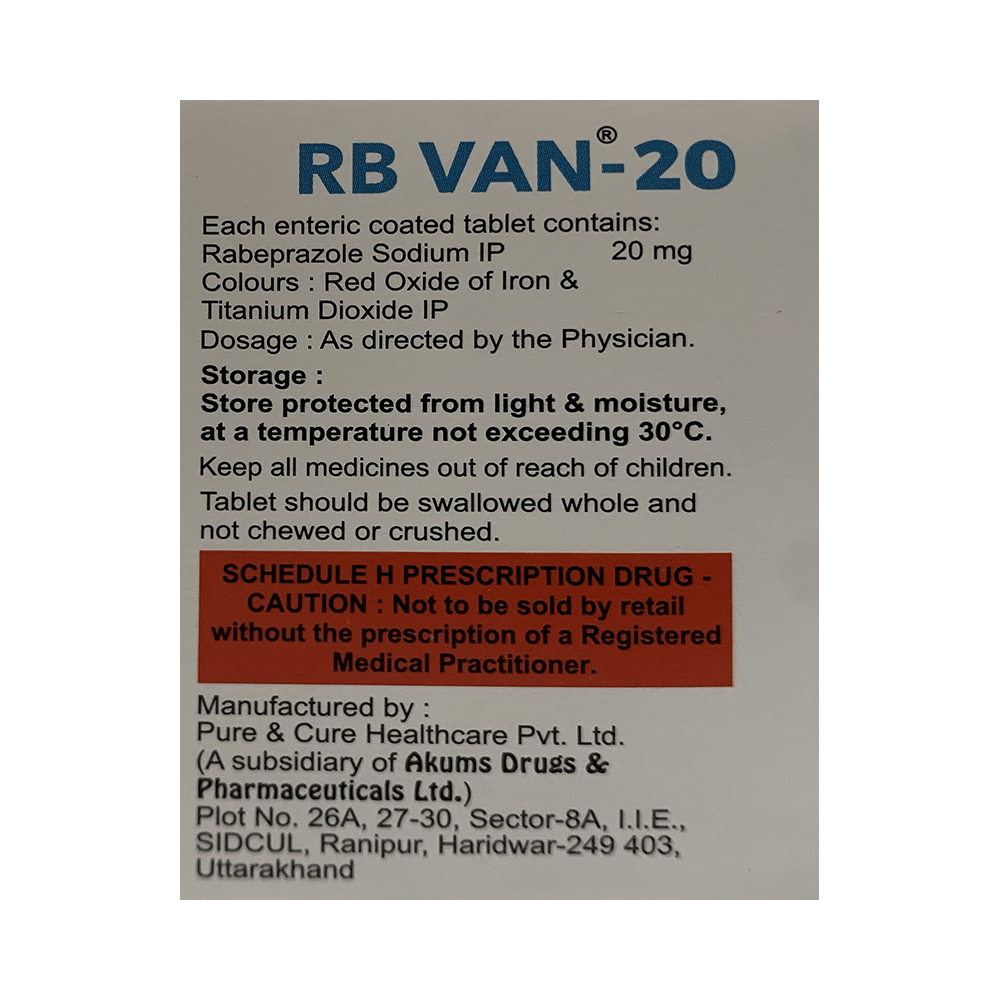RB Van 20 Tablet is a medicine that reduces the amount of acid produced in your stomach. It is used in the treatment of acid-related diseases of the stomach and intestine such as acid reflux, peptic ulcer disease, and Zollinger-Ellison syndrome. It provides relief from symptoms and promotes healing. RB Van 20 Tablet medicine should be taken one hour before a meal, preferably in the morning. The dose will depend on your underlying condition and how you respond to the medicine. Try to take it regularly at the same time each day as advised by your doctor. You should keep on taking it as prescribed even if your symptoms disappear quickly. You may be able to help improve your symptoms by eating smaller meals more often and avoiding caffeinated drinks like tea and coffee, and spicy or fatty foods.This medicine's most common side effects include nausea, vomiting, headache, dizziness, flatulence, diarrhea, and stomach pain. These tend to be mild but talk to your doctor if they bother you or do not go away. The risk of side effects may increase the longer you take this medicine. Long-term use (more than 1 year) may increase your risk for bone fractures, especially with higher doses. Talk to your doctor about ways to prevent bone loss (osteoporosis), like taking calcium and vitamin D supplements.Low blood magnesium levels (hypomagnesemia) have been seen in some people taking this medicine for 3 months or more. This may lead to tiredness, confusion, dizziness, muscle twitches, and an irregular heartbeat. Your doctor may monitor your magnesium levels to prevent this.RB Van 20 Tablet is not suitable for some people. Before taking this medicine, you need to tell your doctor if you have severe liver problems, are taking medicines for HIV, have ever had an allergic reaction to similar medicines in the past, or suffer from bone loss (osteoporosis). Pregnant or breastfeeding women should also consult their doctor before taking it. Avoid drinking alcohol as it makes your stomach produce excessive acid and can worsen your symptoms. Do not drive or use machinery or tools, if this medicine makes you feel dizzy or sleepy.
