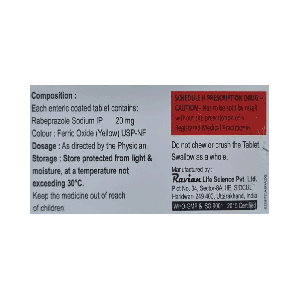 Rbb 20 Tablet is a proton pump inhibitor (PPI). It works by reducing the amount of acid in the stomach which helps in relief of acid related indigestion and heartburn.