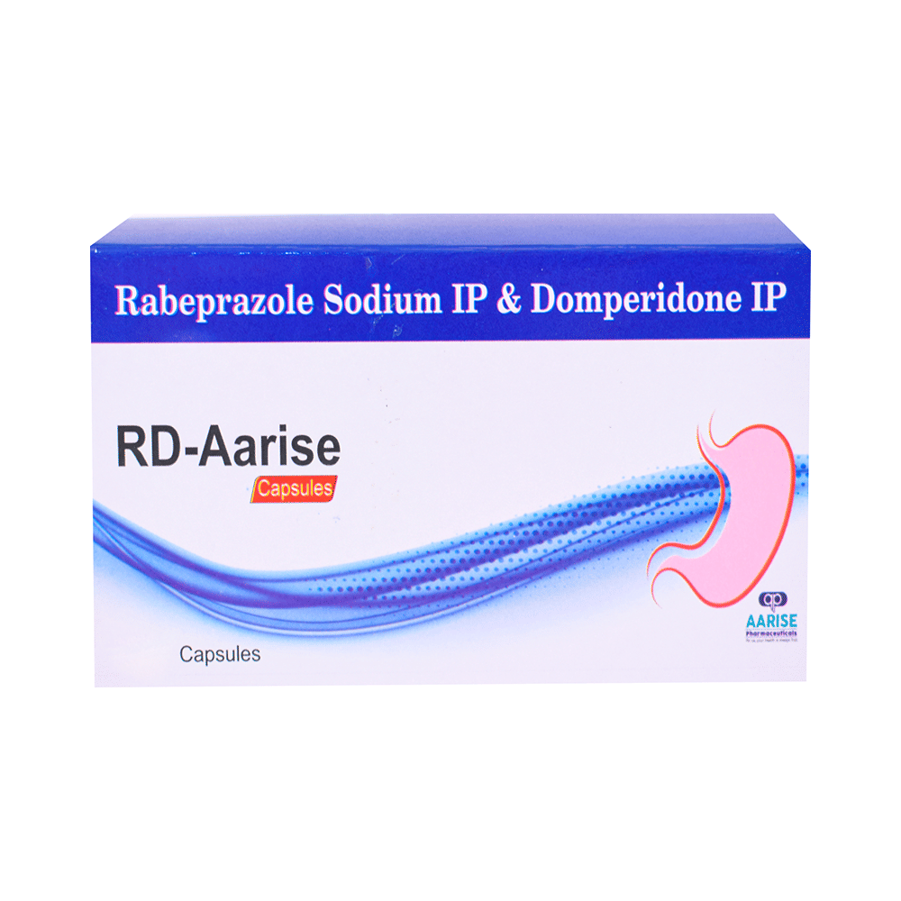 RD-Aarise Capsule is a combination medicine used to treat gastroesophageal reflux disease (acid reflux). It works by relieving the symptoms of acidity such as heartburn, stomach pain, or irritation. It also neutralizes the acid and promotes easy passage of gas to reduce stomach discomfort. RD-Aarise Capsule is taken without food in a dose and duration as advised by the doctor. The dose you are given will depend on your condition and how you respond to the medicine. You should keep taking this medicine for as long as your doctor recommends. If you stop treatment too early your symptoms may come back and your condition may worsen. Let your healthcare team know about all other medications you are taking as some may affect, or be affected by this medicine.The most common side effects are diarrhea, stomach pain, dryness in the mouth, headache, flatulence, and weakness. Most of these are temporary and usually resolve with time. Contact your doctor straight away if you are at all concerned about any of these side effects. This medicine may cause dizziness and sleepiness, so do not drive or do anything that requires mental focus until you know how this medicine affects you. Avoid drinking alcohol while taking this medicine as it can worsen your sleepiness. Lifestyle modifications like having cold milk and avoiding hot tea, coffee, spicy food or chocolate can help you to get better results.Before you start taking this medicine it is important to inform your doctor if you are suffering from kidney or liver disease. You should also tell your doctor if you are pregnant, planning pregnancy or breastfeeding.