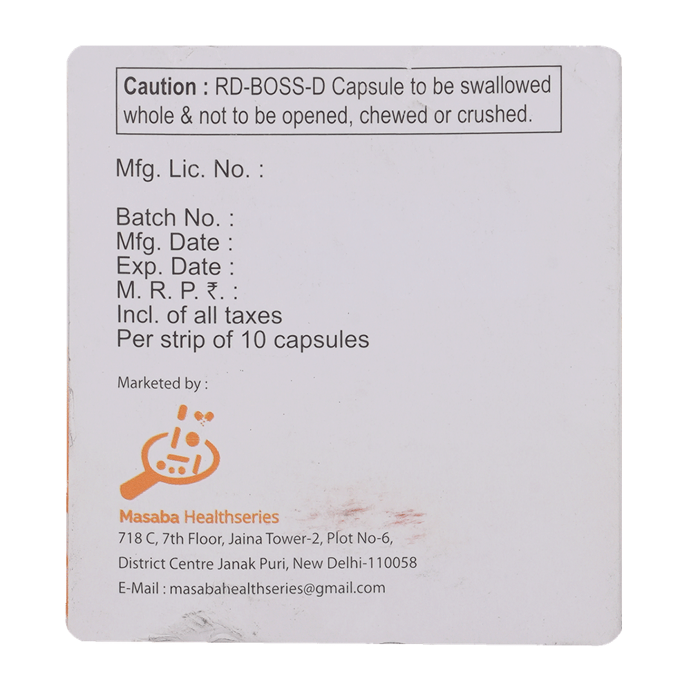 RD Boss D 30mg/40mg Capsule SR is a prescription medicine used to treat gastroesophageal reflux disease (acid reflux). It helps relieve symptoms such as heartburn, stomach pain, or irritation. It also neutralizes the acid in the stomach and promotes easy gas passage to reduce stomach discomfort. RD Boss D 30mg/40mg Capsule SR is best taken on an empty stomach. Take it in the dose and duration advised by the doctor. Continue taking this medicine for as long as your doctor recommends. If you stop treatment too early, your symptoms may come back, and your condition may worsen. Let your doctor know about all other medications you are taking, as some may affect, or be affected by, this medicine.The most common side effects of RD Boss D 30mg/40mg Capsule SR include diarrhea, flatulence, stomach pain, dryness in the mouth, and headache. Most of these are temporary and usually resolve with time. Contact your doctor straight away if you are at all concerned about any side effects. It may also cause sleepiness and dizziness, so do not drive or do anything that requires mental focus until you know how this medicine affects you.Before taking this medicine, you should tell your doctor if you are pregnant, planning pregnancy, or breastfeeding. You should also tell your doctor if you have severe liver disease so that your doctor can prescribe a suitable dose for you. Lifestyle modifications like having cold milk and avoiding hot tea, coffee, spicy food, or chocolate can help you get better results.