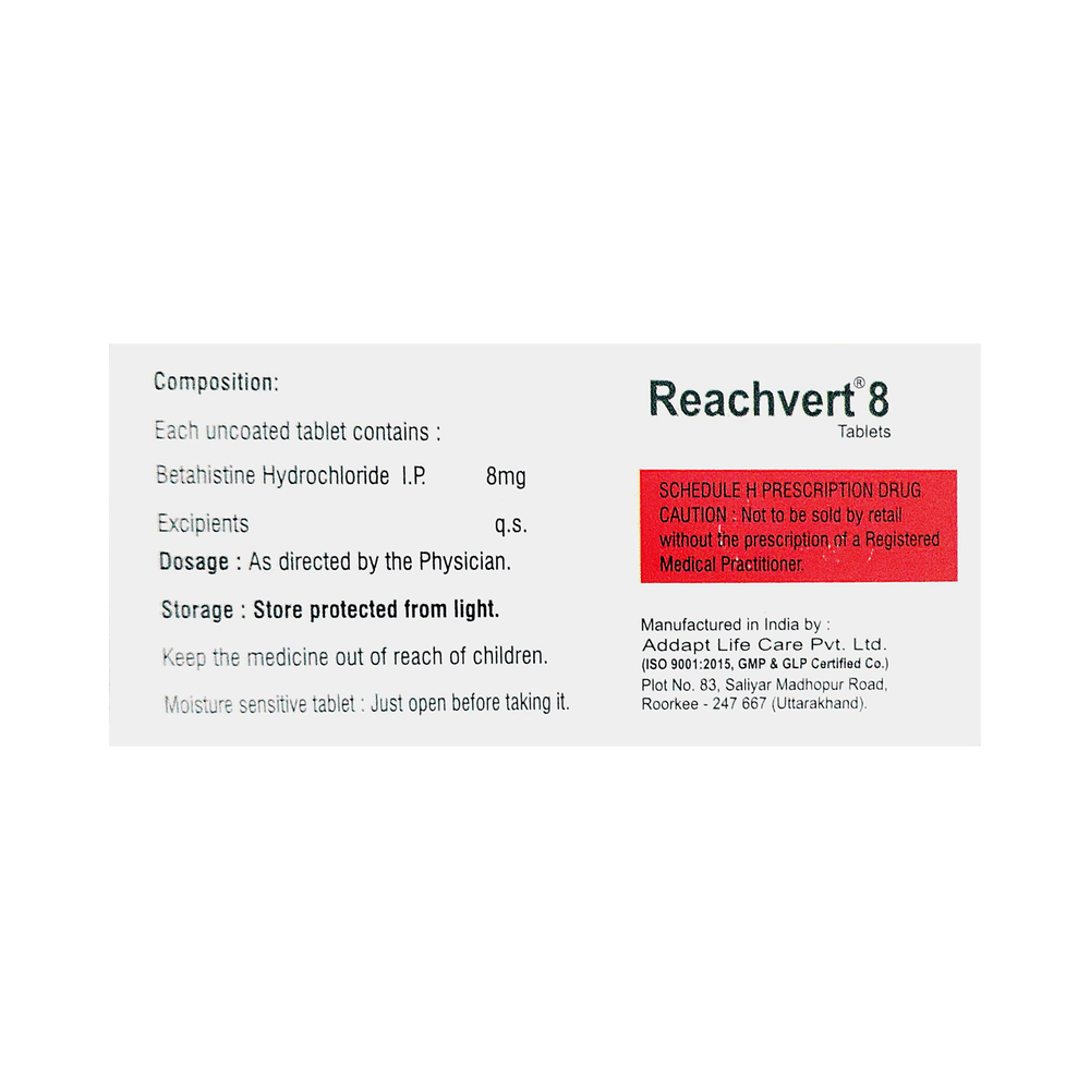 Reachvert 8 Tablet is a histamine analog. It works by improving the blood flow in the inner ear which reduces the pressure of excess fluid there. Excess fluid can send signals to the brain causing nausea, dizziness or spinning sensations (symptoms of Ménière's disease). Reachvert 8 Tablet additionally dampens down the nerve signals sent from the inner ear to the brain relieving the symptoms of Ménière's disease.