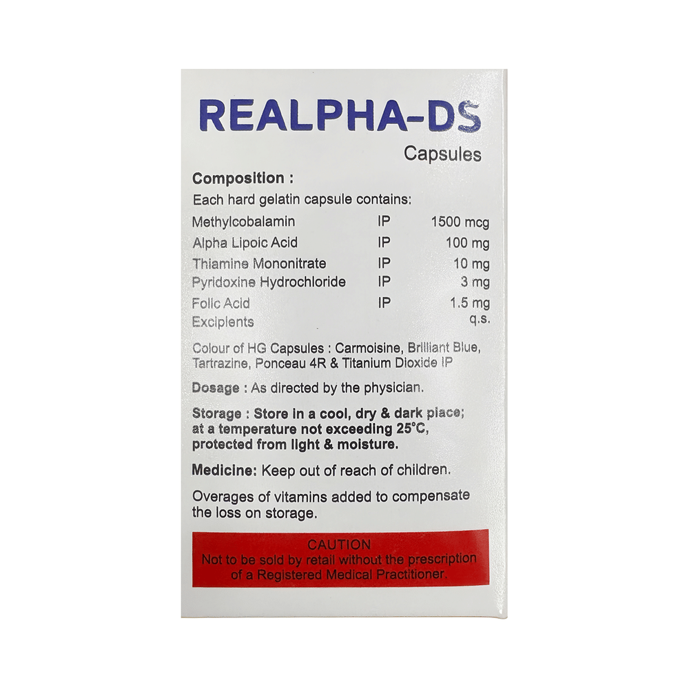 Realpha-DS Capsule is a combination of multiple nutritional supplements. It is taken to treat nutritional deficiencies such as vitamins and other minerals in the body. It fulfills the deficiency to prevent related disorders. It also ensures proper growth and functioning of the body. Realpha-DS Capsule may be taken with or without food. Take it in the dose and duration advised by the doctor. Take it regularly at the same time each day to get maximum benefits from it. Do not take it more than or longer than prescribed by the doctor, as that may cause harmful effects.It is generally safe medicine with little or no side effects. However, if you experience any symptoms which you think are caused by the medicine, let your doctor know. It is important to let your doctor know if you have any preexisting medical conditions or if you are taking any other medications. This will ensure your safety to use this medicine.