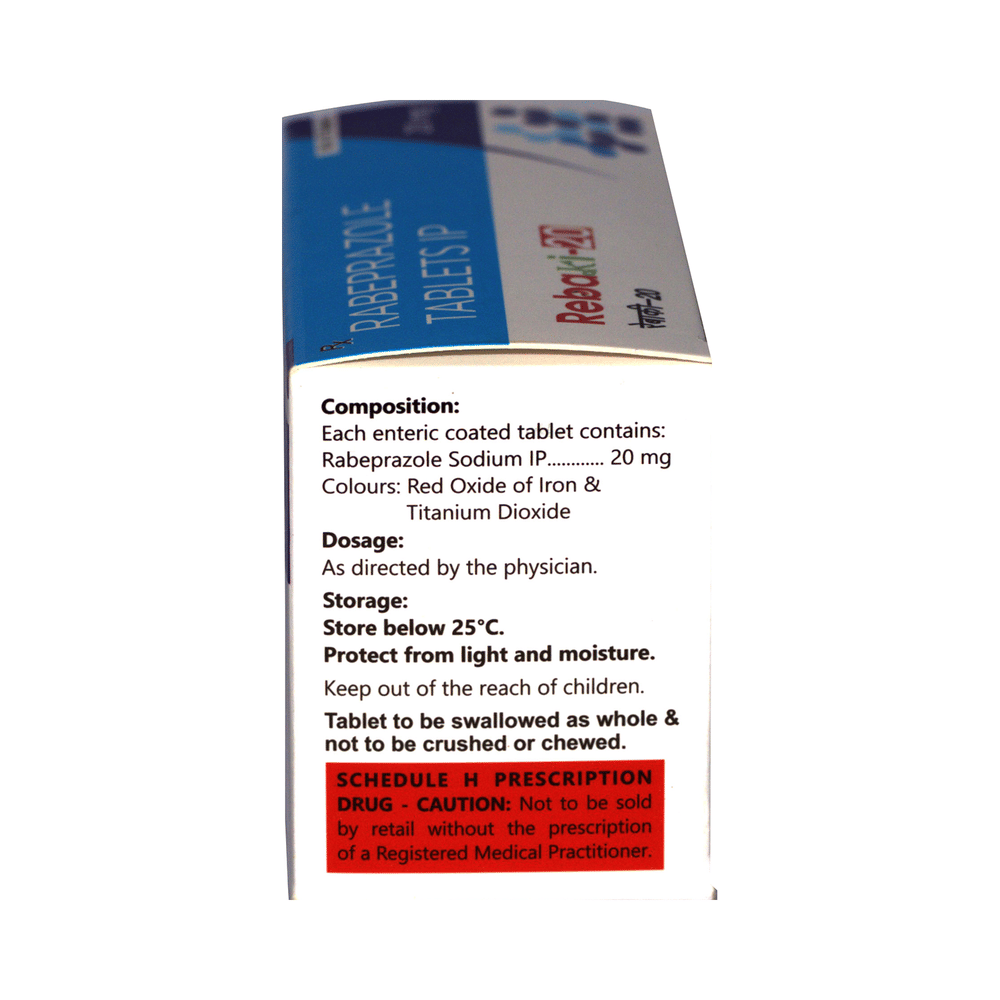 Rebaki 20 Tablet is a medicine that reduces the amount of acid produced in your stomach. It is used in the treatment of acid-related diseases of the stomach and intestine such as acid reflux, peptic ulcer disease, and Zollinger-Ellison syndrome. It provides relief from symptoms and promotes healing. Rebaki 20 Tablet medicine should be taken one hour before a meal, preferably in the morning. The dose will depend on your underlying condition and how you respond to the medicine. Try to take it regularly at the same time each day as advised by your doctor. You should keep on taking it as prescribed even if your symptoms disappear quickly. You may be able to help improve your symptoms by eating smaller meals more often and avoiding caffeinated drinks like tea and coffee, and spicy or fatty foods.This medicine's most common side effects include nausea, vomiting, headache, dizziness, flatulence, diarrhea, and stomach pain. These tend to be mild but talk to your doctor if they bother you or do not go away. The risk of side effects may increase the longer you take this medicine. Long-term use (more than 1 year) may increase your risk for bone fractures, especially with higher doses. Talk to your doctor about ways to prevent bone loss (osteoporosis), like taking calcium and vitamin D supplements.Low blood magnesium levels (hypomagnesemia) have been seen in some people taking this medicine for 3 months or more. This may lead to tiredness, confusion, dizziness, muscle twitches, and an irregular heartbeat. Your doctor may monitor your magnesium levels to prevent this.Rebaki 20 Tablet is not suitable for some people. Before taking this medicine, you need to tell your doctor if you have severe liver problems, are taking medicines for HIV, have ever had an allergic reaction to similar medicines in the past, or suffer from bone loss (osteoporosis). Pregnant or breastfeeding women should also consult their doctor before taking it. Avoid drinking alcohol as it makes your stomach produce excessive acid and can worsen your symptoms. Do not drive or use machinery or tools, if this medicine makes you feel dizzy or sleepy.