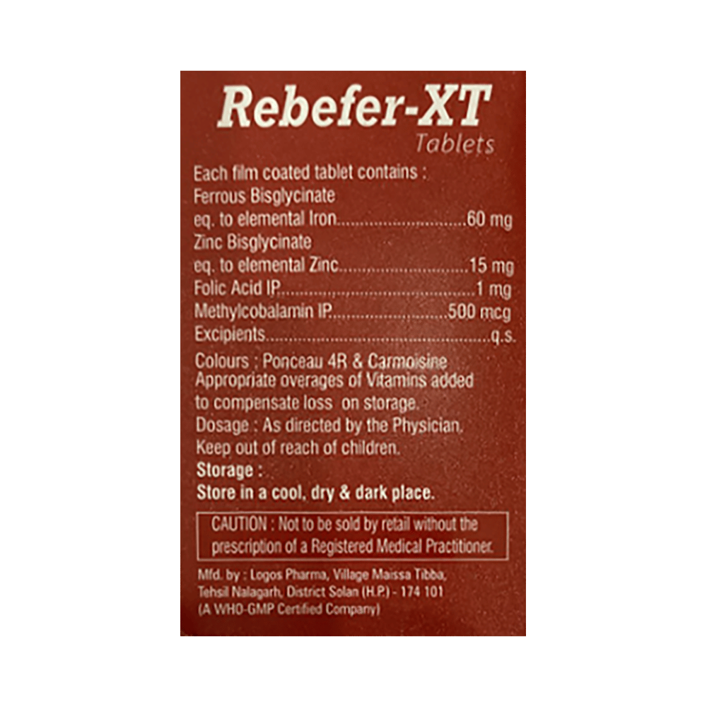 Rebefer XT Tablet is a combination of vitamins and mineral supplements prescribed to treat vitamin and other nutritional deficiencies. It ensures the proper growth and functioning of the body. Rebefer XT Tablet may be taken with or without food. It should be used in the dose and duration prescribed by your doctor. It is advised to take this medicine at a fixed time to avoid missing a dose.This medicine should not be taken more than the recommended dose. It is usually a safe medicine with very minimal or no side effects. However, if you experience severe diarrhea, vomiting, or constipation, you should consult your doctor without delay.Before taking this medicine, tell your doctor if you have any other health conditions. Inform your doctor if you are taking any other medicines or if you are pregnant or breastfeeding. It is advised not to take alcohol after taking this medicine.