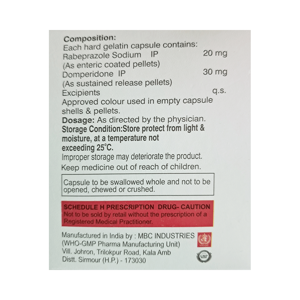 Salt Composition: Domperidone (30mg) + Rabeprazole (20mg)