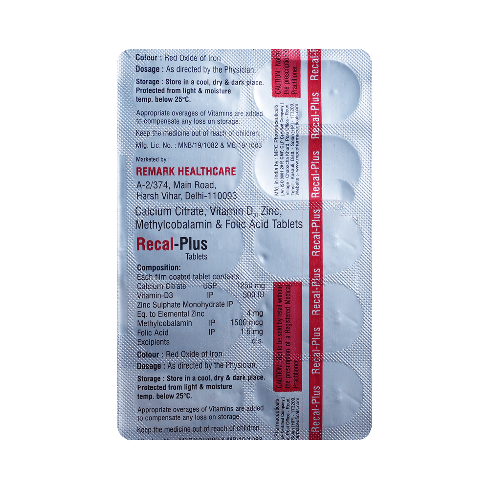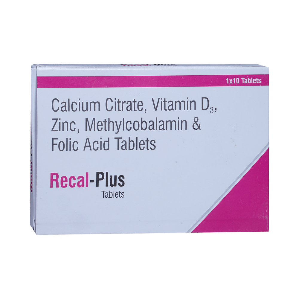 REcal Plus Tablet is used to manage nutritional deficiencies. It provides essential vitamins that support strong bones, improve immunity, and promote healthy nerves and blood, helping restore balance and enhance overall well-being. Take REcal Plus Tablet in the exact dose and duration prescribed by your doctor. Take it regularly and take it at a fixed time every day after meals. For best results, do not skip doses and ensure to complete the full course of treatment. In addition to taking the medicine regularly, eating a healthy, balanced diet and staying well-hydrated can help enhance the effectiveness of the supplement.Common side effects of REcal Plus Tablet include nausea, upset stomach, constipation or diarrhea, and a metallic taste in the mouth. These effects are generally temporary and go away on their own. If they persist or become bothersome, consult with your doctor for guidance.Before starting REcal Plus Tablet, inform your doctor if you have any medical conditions. Let your doctor also know about any other vitamins or supplements you may be taking to avoid an overdose of certain nutrients. Pregnant or breastfeeding women should use this supplement only if advised by their doctors.