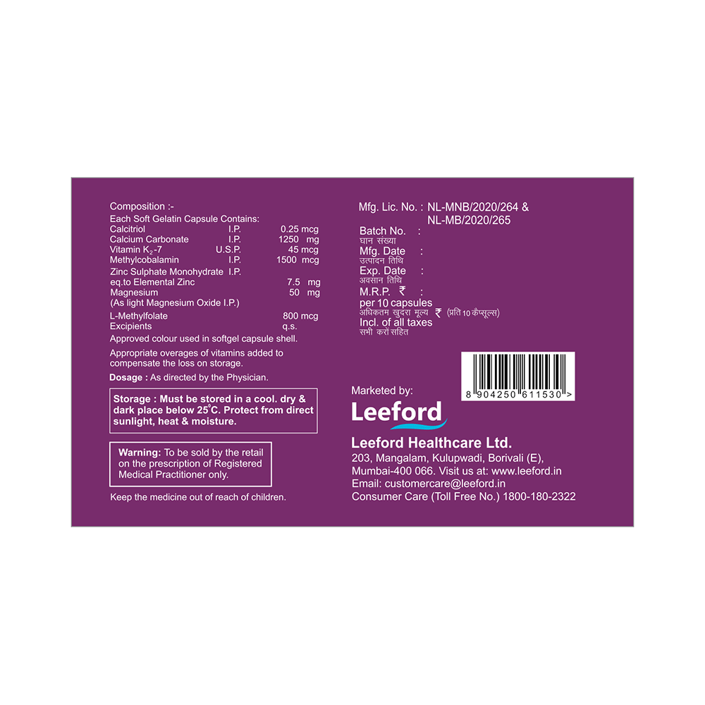 Salt Composition: Calcitriol (0.25mcg) + Calcium Carbonate (1250mg) + Zinc (7.5mg) + Magnesium (50mg) + Vitamin K2-7 (45mcg) + Methylcobalamin (1500mcg) + L-Methyl Folate (800mcg)